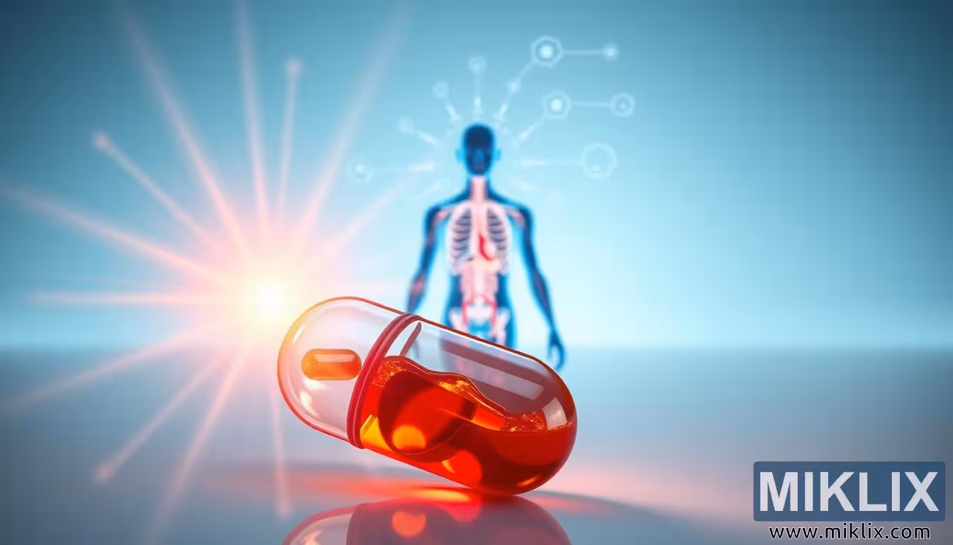 ஆற்றல் கோடுகள் மற்றும் மனித நிழற்படத்துடன் கூடிய CoQ10 காப்ஸ்யூலின் கதிரியக்க 3D விளக்கம், இதயம், ஆக்ஸிஜனேற்ற எதிர்ப்பு மற்றும் செல்லுலார் ஆற்றல் ஆதரவைக் குறிக்கிறது.