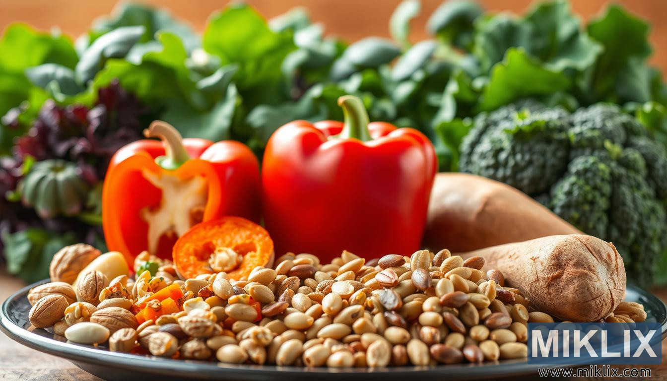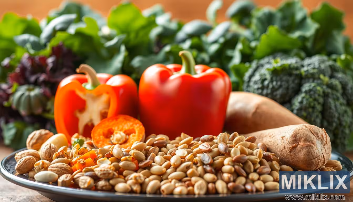 காட்சியில் உள்ள விளக்குகள் அதன் கவர்ச்சியை அதிகரிக்கின்றன, சூடான, இயற்கையான வெளிச்சம் ஏற்பாட்டின் மீது மெதுவாகப் பாய்கிறது. இந்த மென்மையான ஒளி, குடை மிளகாயின் பளபளப்பான தோல், பருப்பு வகைகளின் மேட் அமைப்பு மற்றும் இலை கீரைகளின் மென்மையான முகடுகளை எடுத்துக்காட்டுகிறது, இது உணவை வரவேற்கும் மற்றும் ஊட்டமளிக்கும் வகையில் தோன்றும் ஒரு தொட்டுணரக்கூடிய தரத்தை உருவாக்குகிறது. நிழல்கள் தட்டு மற்றும் காய்கறிகளின் மீது மெதுவாக விழுகின்றன, பரிமாண உணர்வை மேம்படுத்துகின்றன மற்றும் பார்வையாளருக்கு ஒரு பழமையான மேஜையில் காட்டப்படும் உண்மையான, ஏராளமான அறுவடையின் தோற்றத்தை அளிக்கின்றன. ஒட்டுமொத்த மனநிலை அரவணைப்பு மற்றும் இயற்கையான மிகுதியாக உள்ளது, இந்த உணவுகள் புதிதாக சேகரிக்கப்பட்டு அவற்றின் உயிர் கொடுக்கும் பண்புகளை வெளிப்படுத்த கவனமாக ஏற்பாடு செய்யப்பட்டுள்ளன.