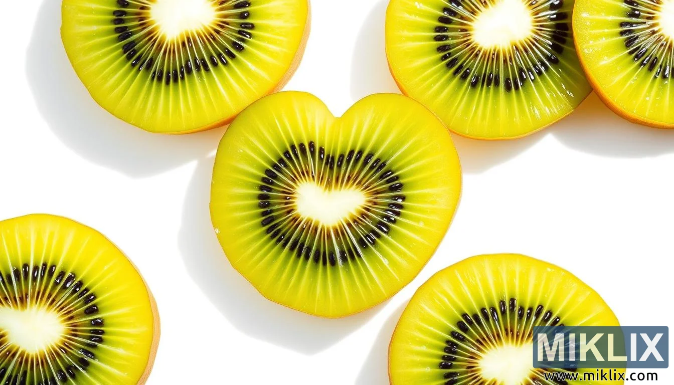இந்தப் படம், தங்க நிற கிவி துண்டுகளின் நேர்த்தியான கலவையை, ஒரு அழகிய வெள்ளை பின்னணியில் காட்சிப்படுத்தப்பட்டுள்ளது, ஒவ்வொன்றும் புத்துணர்ச்சியையும் உயிர்ச்சக்தியையும் வெளிப்படுத்துகின்றன. மையத்தில் ஒரு குறிப்பாக குறிப்பிடத்தக்க துண்டு உள்ளது, அதன் இயற்கையான வரையறைகள் ஒரு நுட்பமான இதய வடிவத்தை உருவாக்குகின்றன, இது உடனடியாக கண்ணை ஈர்க்கிறது மற்றும் அரவணைப்பு மற்றும் ஊட்டச்சத்தின் குறியீட்டு உணர்வோடு அமைப்பை உட்செலுத்துகிறது. பழத்தின் சதை ஒரு பிரகாசமான தங்க-மஞ்சள் நிறத்துடன் ஒளிர்கிறது, இதய வடிவ மையத்திற்கு அருகில் லேசான டோன்களை நோக்கி நுட்பமாக மாறுகிறது, அங்கு ஒளிஊடுருவக்கூடிய சதை கிட்டத்தட்ட ஒளிரும். இந்த மென்மையான மையத்தைச் சுற்றி, சிறிய, ஜெட்-கருப்பு விதைகளின் சரியான வளையம் ஒரு வியத்தகு மாறுபாட்டை உருவாக்குகிறது, அவற்றின் கூர்மையான கோடுகள் சூரியக் கதிர்கள் அல்லது ஒரு சக்கரத்தின் மென்மையான ஆரங்கள் போல வெளிப்புறமாகப் பிரகாசிக்கின்றன. விதைகள் பிரகாசமான பின்னணியில் வாழ்க்கையுடன் துடிப்பது போல் தெரிகிறது, இந்த எளிய ஆனால் அழகான பழத்தில் பிடிக்கப்பட்ட இயற்கையின் துல்லியம் மற்றும் சமநிலையின் தோற்றத்தை வலுப்படுத்துகிறது.