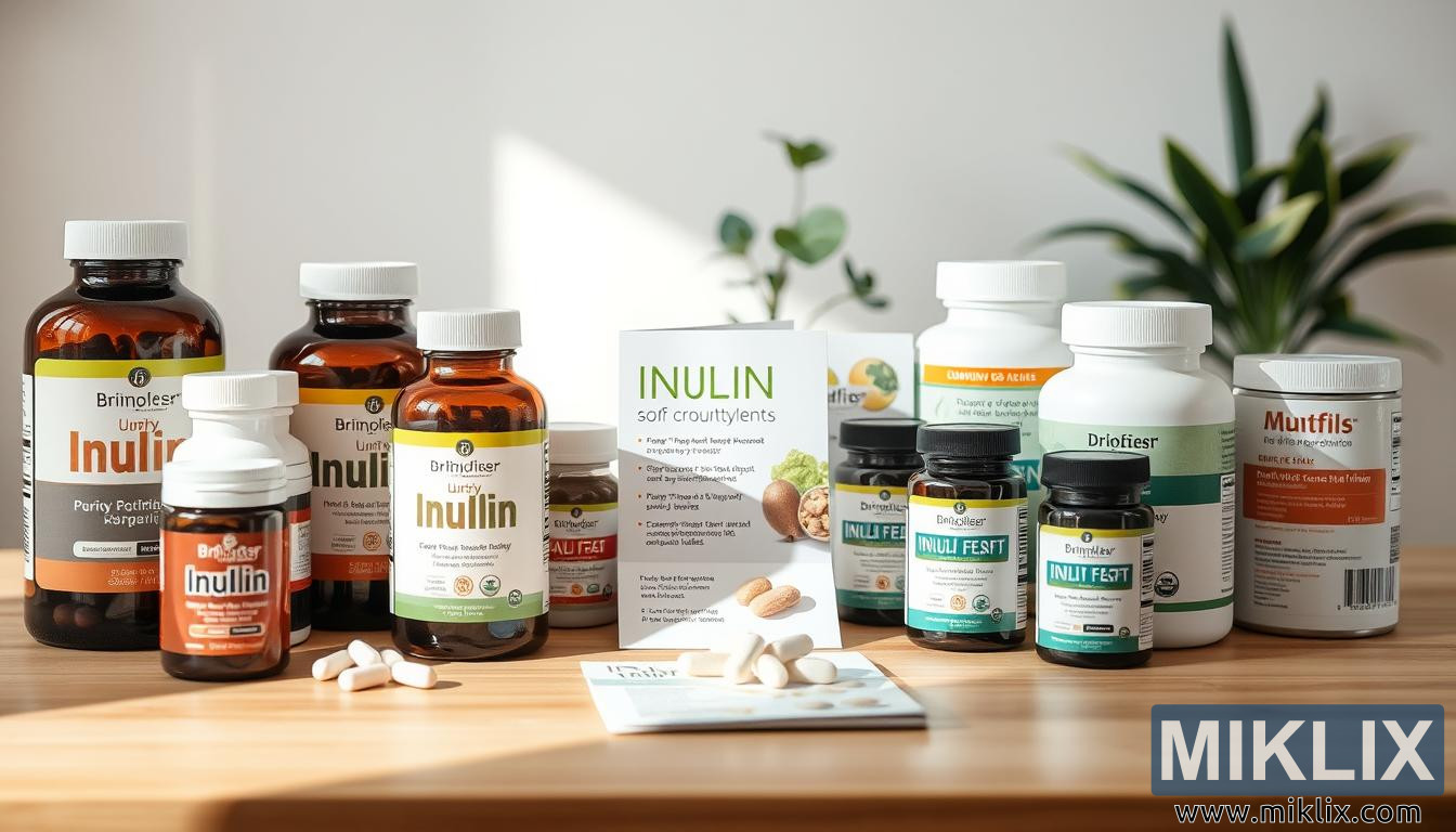 மரத்தாலான மேசையில் தூய்மை, சுகாதார நன்மைகள் மற்றும் தகவலறிந்த நல்வாழ்வுத் தேர்வுகளை எடுத்துக்காட்டும் பிரசுரங்களுடன் கூடிய இன்யூலின் சப்ளிமெண்ட் பாட்டில்களின் சுத்தமான காட்சி.