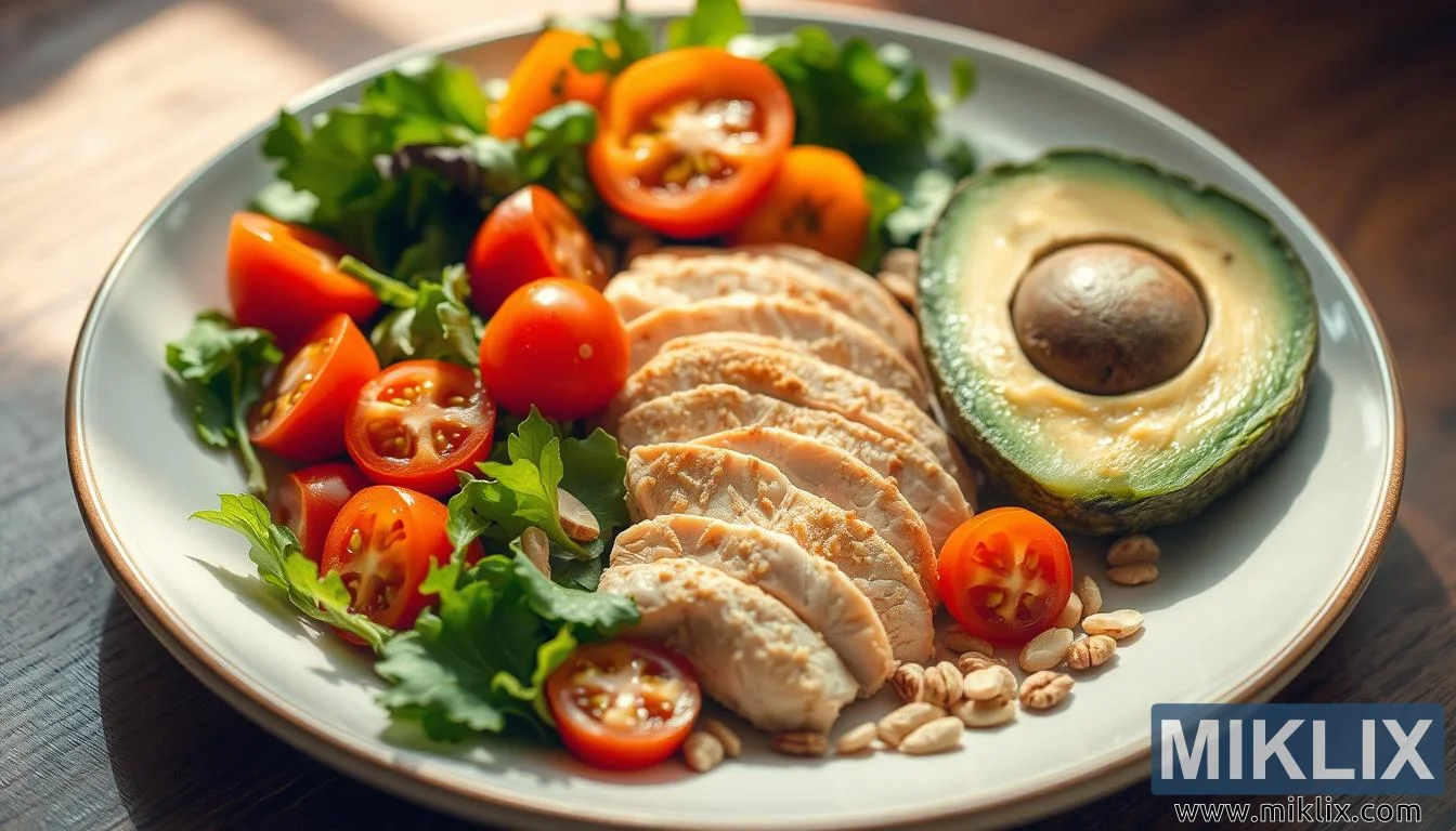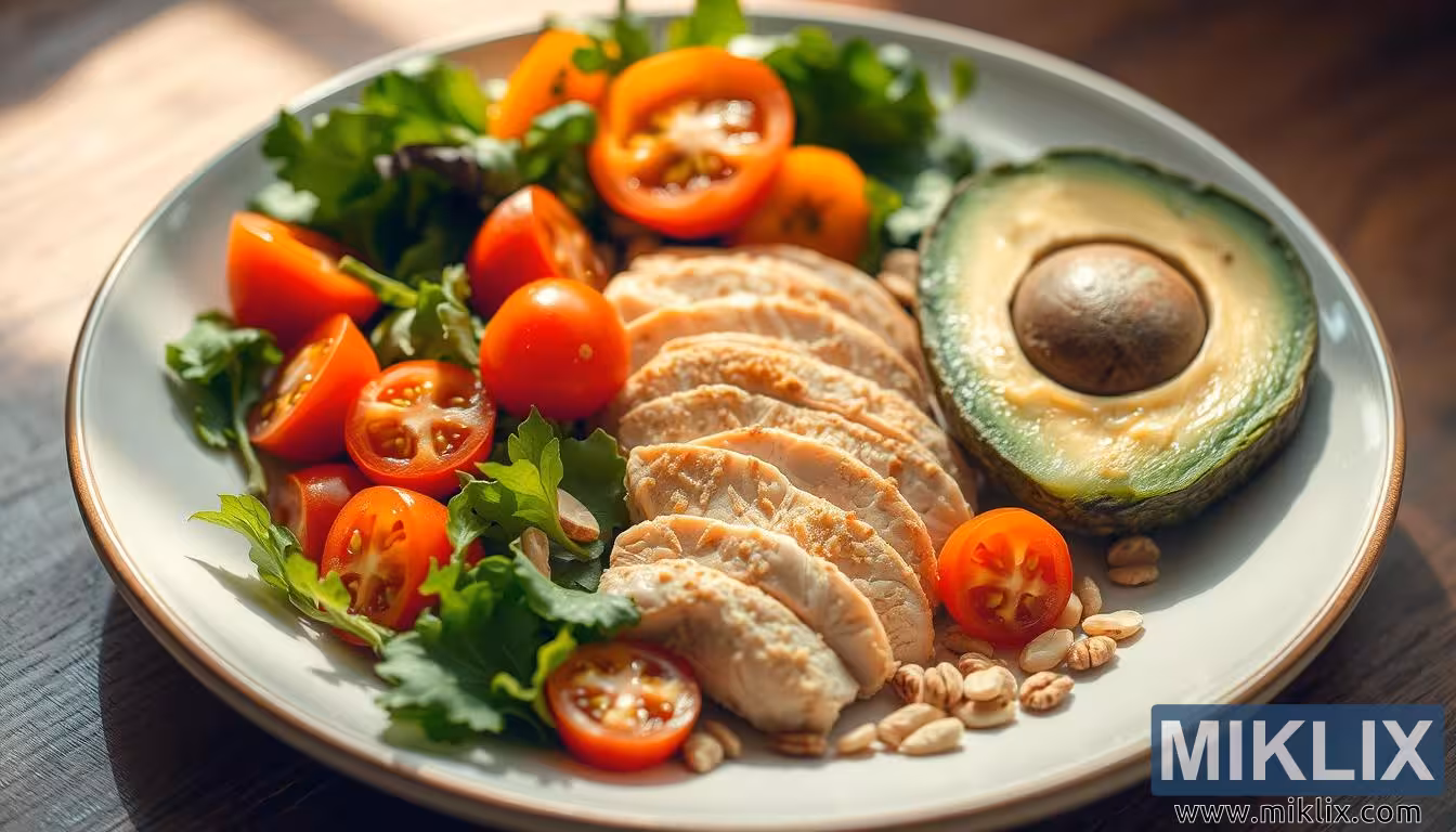 இந்தப் படம், முழுமையான, ஊட்டச்சத்து நிறைந்த உணவுகளின் அழகாக அமைக்கப்பட்ட தட்டைக் காட்டுகிறது, இவை ஒன்றாகச் சேர்ந்து சமச்சீர் உணவின் தெளிவான மற்றும் வரவேற்கத்தக்க உருவப்படத்தை உருவாக்குகின்றன. கலவையின் மையத்தில், மெல்லிய கோழி மார்பகத்தின் நேர்த்தியான விசிறி வரிசை உள்ளது, அதன் மேற்பரப்பு மெதுவாக தங்க நிறத்தில் வறுக்கப்பட்டு, மென்மையான, ஜூசி அமைப்பைத் தக்க வைத்துக் கொள்கிறது. ஒவ்வொரு துண்டும் சூடான, இயற்கை ஒளியின் கீழ் மின்னுகிறது, இது தயாரிப்பில் புத்துணர்ச்சி மற்றும் கவனிப்பு இரண்டையும் குறிக்கிறது. வலதுபுறத்தில், ஒரு சரியாக பாதியாக வெட்டப்பட்ட வெண்ணெய் பழம் அதன் கிரீமி, வெளிர் பச்சை சதையுடன் வெளிப்படுகிறது, இது கருமையான வெளிப்புற தோல் மற்றும் அதன் மையத்தில் மென்மையான வட்ட விதைக்கு எதிராக வேறுபடுகிறது. வெண்ணெய் பழம் காட்சி சமநிலையை வழங்குவதோடு மட்டுமல்லாமல், ஊட்டச்சத்து மற்றும் ஆரோக்கியமான கொழுப்புகளையும் குறிக்கிறது, அதன் செழுமையான நிறம் மற்றும் வெண்ணெய் போன்ற அமைப்பு, திருப்தி மற்றும் மகிழ்ச்சி இரண்டையும் ஆரோக்கியமான முறையில் வழங்குகிறது.