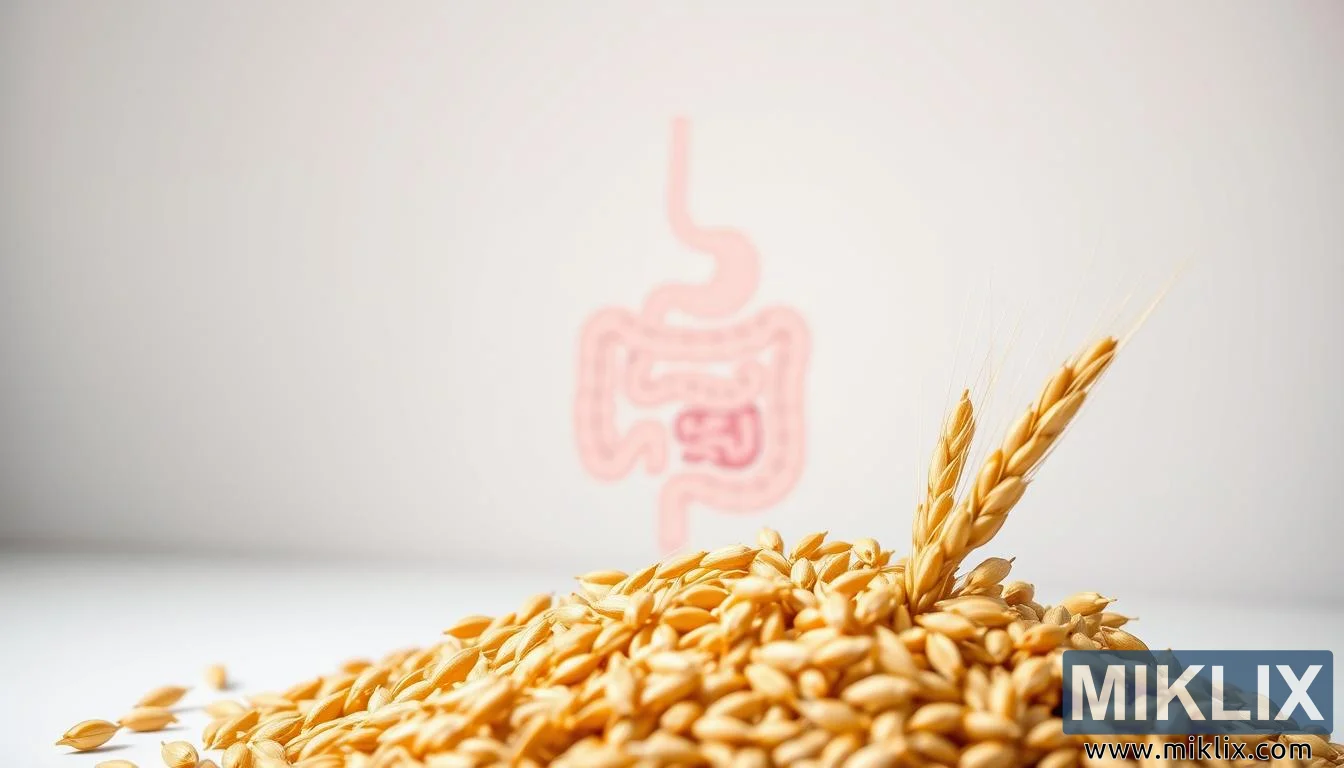 பகட்டான செரிமான அமைப்பு மற்றும் குடல் நுண்ணுயிரிகளுடன் கூடிய பார்லி தானியங்களின் உயர் தெளிவுத்திறன் படம், குடல் ஆரோக்கியம் மற்றும் செரிமானத்திற்கான பார்லியின் நார்ச்சத்து நன்மைகளை எடுத்துக்காட்டுகிறது.
