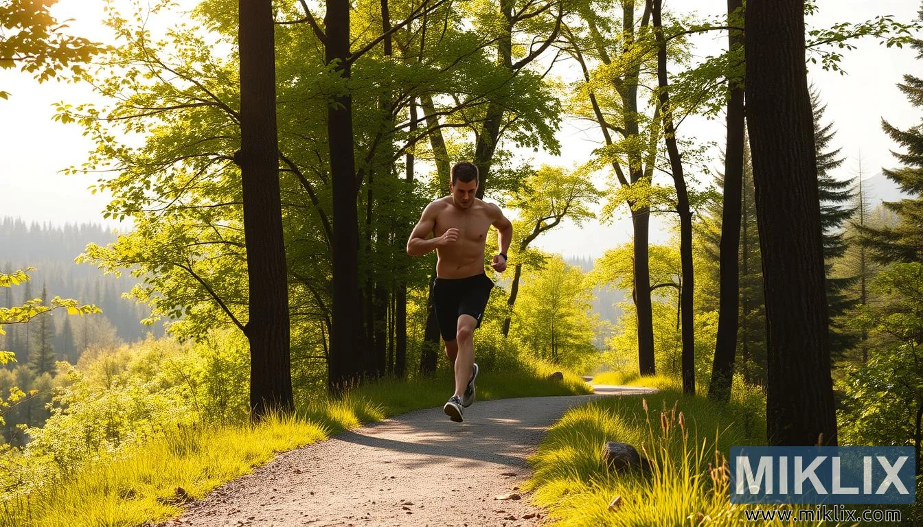 தங்க நிற சூரிய ஒளியின் கீழ் காட்டுப் பாதையில் ஒரு தகுதியான ஓட்டப்பந்தய வீரர், சகிப்புத்தன்மை, உயிர்ச்சக்தி மற்றும் வெளிப்புற உடற்பயிற்சியின் இணக்கத்தை அடையாளப்படுத்துகிறார்.