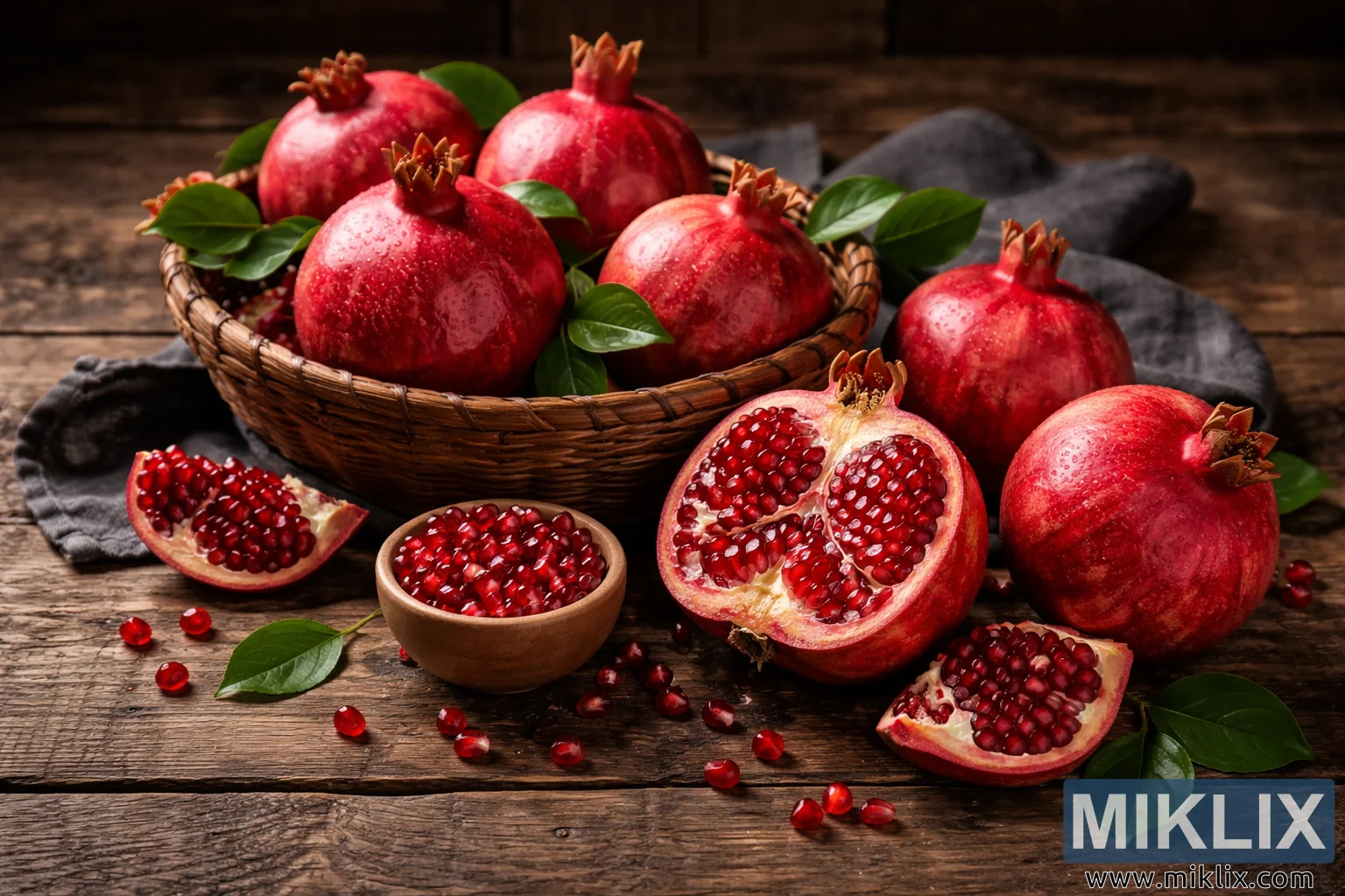 ஒரு பரந்த, நிலப்பரப்பு சார்ந்த ஸ்டில் லைஃப் புகைப்படம், ஒரு பழமையான மர மேசையில் காட்டப்படும் பழுத்த மாதுளைகளின் தாராளமான அமைப்பைக் காட்டுகிறது. மேசையின் மேற்பரப்பு கரடுமுரடான, வானிலையால் பாதிக்கப்பட்ட பலகைகளால் ஆனது, அதன் தானியங்கள், விரிசல்கள் மற்றும் சீரற்ற விளிம்புகள் தெளிவாகத் தெரியும், இது முழு காட்சிக்கும் அரவணைப்பு மற்றும் நம்பகத்தன்மையை அளிக்கிறது. மையத்தில் முழு மாதுளைகளால் நிரப்பப்பட்ட ஒரு ஆழமற்ற நெய்த கூடை உள்ளது, அவற்றின் அடர்த்தியான சிவப்பு தோல்கள் சிறிய ஈரப்பதத் துளிகளால் மின்னுகின்றன, அவை இப்போதுதான் கழுவப்பட்டதைப் போல. பழங்கள் அவற்றின் இயற்கையான புல்லிகளால் முடிசூட்டப்பட்டுள்ளன, ஒவ்வொன்றும் வடிவத்திலும் உயரத்திலும் சற்று வித்தியாசமாக உள்ளன, கலவையில் கரிம மாறுபாட்டைச் சேர்க்கின்றன. பழங்களுக்கு இடையில் புதிய பச்சை இலைகள், பளபளப்பான மற்றும் மென்மையானவை, மாதுளையின் ஆழமான கருஞ்சிவப்பு நிறங்களுக்கு எதிராக ஒரு தெளிவான வண்ண வேறுபாட்டை வழங்குகின்றன.