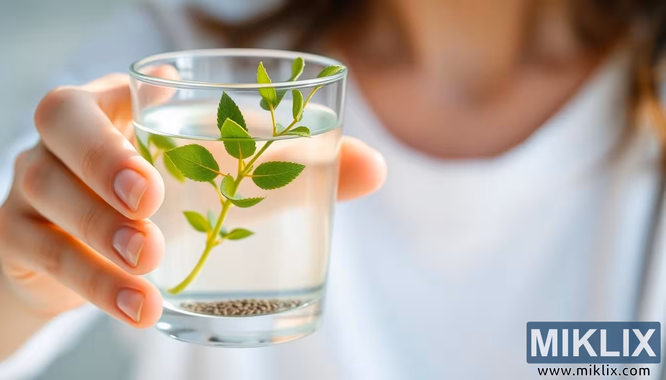 பச்சை இலைகளுடன் ஒரு கிளாஸ் தண்ணீரைப் பிடித்துக் கொண்டிருக்கும் ஒரு கையின் அருகாமைப் புகைப்படம், சமநிலையையும், இரத்த சர்க்கரை ஆரோக்கியத்தை ஆதரிப்பதில் ஆளிவிதை போன்ற இயற்கை உணவுகளின் பங்கையும் குறிக்கிறது.