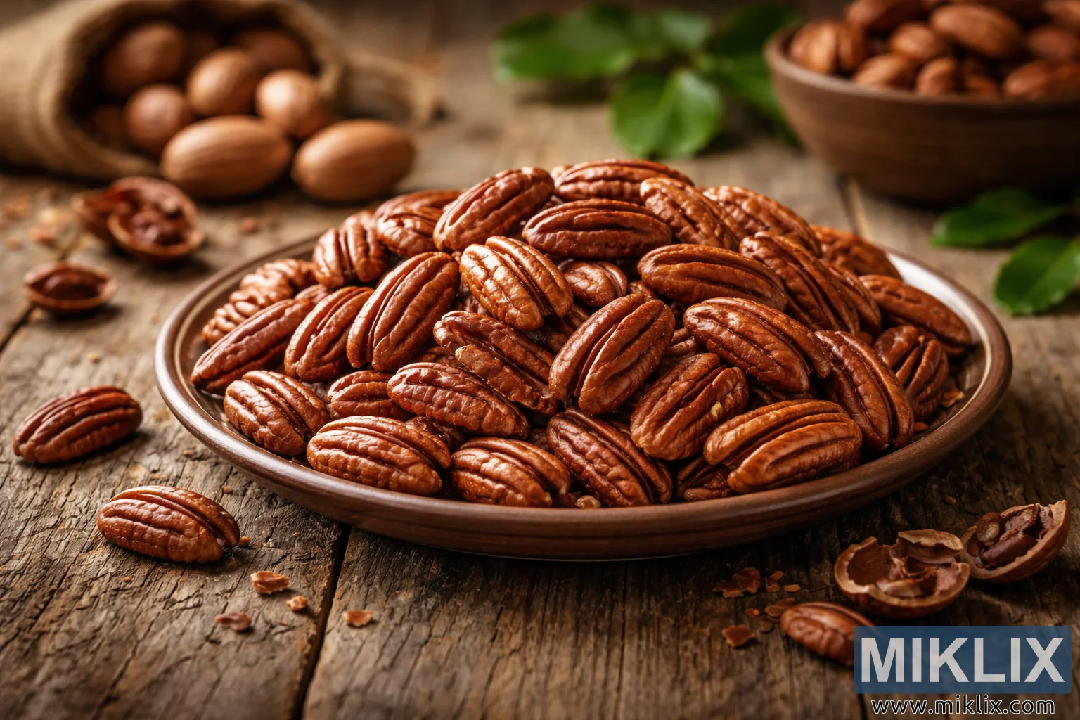 தட்டைச் சுற்றி, பல தளர்வான பெக்கன்களும் விரிசல் அடைந்த ஓடுகளின் துண்டுகளும் மேஜையின் மேல் சாதாரணமாக சிதறிக்கிடக்கின்றன, கொட்டைகள் சமீபத்தில் கையால் உரிக்கப்பட்டதைப் போல, நம்பகத்தன்மை மற்றும் முறைசாரா உணர்வை வலுப்படுத்துகின்றன. மெதுவாக மங்கலான பின்னணியில், ஒரு சிறிய பர்லாப் சாக்கு முழு பெக்கன்களையும் அவற்றின் ஓடுகளில் ஓரளவு ஊற்றி, காட்சிக்கு ஒரு தொட்டுணரக்கூடிய, மண் போன்ற உறுப்பைச் சேர்க்கிறது. அருகில், கூடுதல் பெக்கன்களால் நிரப்பப்பட்ட ஒரு எளிய மரக் கிண்ணம் மையப் பொருளை அதிலிருந்து திசைதிருப்பாமல் எதிரொலிக்கிறது.