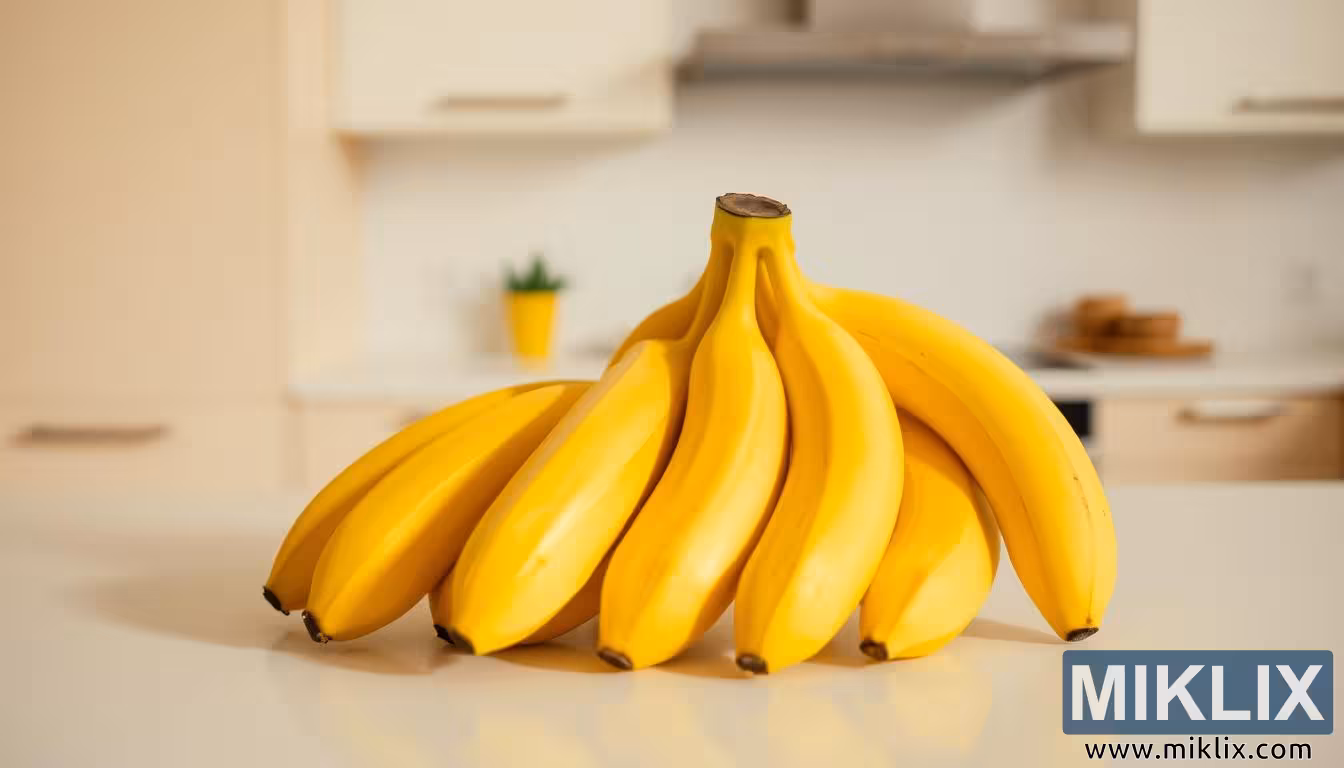 பின்னணியில், ஒரு குறைந்தபட்ச சமையலறை, கலவையின் நுட்பமான நுட்பத்தை வலுப்படுத்துகிறது. கிரீம் மற்றும் பழுப்பு நிற நடுநிலை டோன்கள் காட்சியை வடிவமைக்கின்றன, அவற்றின் மென்மையான சாயல்கள் கவுண்டர்டாப்புடன் தடையின்றி கலக்கின்றன, அதே நேரத்தில் வாழைப்பழங்கள் சந்தேகத்திற்கு இடமின்றி மையப் புள்ளியாக இருக்க அனுமதிக்கின்றன. அன்றாட வாழ்க்கையின் குறிப்புகள் நுட்பமாகத் தெரியும்: மஞ்சள் தொட்டியில் ஒரு மங்கலான செடி வாழைப்பழங்களின் தங்க நிறங்களுக்கு ஒரு மகிழ்ச்சியான எதிரொலியைச் சேர்க்கிறது, அதே நேரத்தில் தூரத்தில் உள்ள மர கூறுகள் அரவணைப்பு மற்றும் வீட்டுத்தன்மையைக் குறிக்கின்றன. அலமாரி மற்றும் நவீன வடிவமைப்பு கோடுகள் எளிமை மற்றும் ஒழுங்கைப் பற்றி பேசுகின்றன, குழப்பம் மற்றும் கவனச்சிதறல் இல்லாத இடம், தினசரி வழக்கங்களில் வாழைப்பழங்களைச் சேர்ப்பதன் எளிமை மற்றும் நடைமுறைத்தன்மையை பிரதிபலிக்கிறது. அத்தகைய சூழலுக்குள் பழத்தை நிலைநிறுத்துவதன் மூலம், படம் இயற்கை விளைபொருட்களுக்கும் சமகால வாழ்க்கைக்கும் இடையிலான இடைவெளியைக் குறைக்கிறது, ஆரோக்கியம் மற்றும் வசதி இரண்டையும் மதிக்கும் வாழ்க்கை முறைக்கு வாழைப்பழங்கள் எவ்வாறு தடையின்றி பொருந்துகின்றன என்பதை எடுத்துக்காட்டுகிறது.