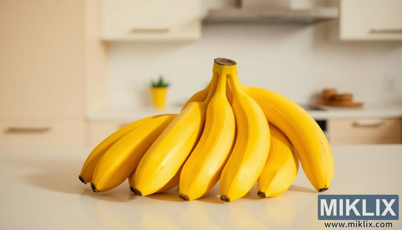 குறைந்தபட்ச சமையலறை பின்னணியுடன் கூடிய வெள்ளை நிற கவுண்டர்டாப்பில் அழகாக அமைக்கப்பட்ட பழுத்த வாழைப்பழங்கள், அவற்றின் வசதி, பல்துறை திறன் மற்றும் தினசரி ஊட்டச்சத்து ஆகியவற்றைக் குறிக்கின்றன.