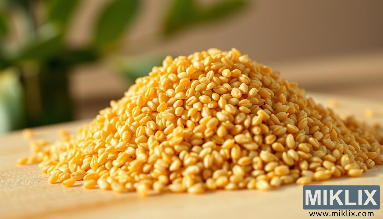 இந்தப் படம், தங்க நிற குயினோவா தானியங்களின் குவியலின் வியக்கத்தக்க விரிவான காட்சியை வழங்குகிறது, இது இயற்கையாகவே ஒரு சிறிய மலையைப் போல அமைந்துள்ளது, இது இயற்கையாகவே கண்ணை அதன் உச்சத்திற்கு ஈர்க்கிறது. ஒவ்வொரு சிறிய விதையும் சூடான, இயற்கை ஒளியின் செல்வாக்கின் கீழ் ஒளிர்கிறது, அதன் காட்சி செழுமையையும் மண் போன்ற அழகையும் மேம்படுத்தும் ஒரு தங்க நிறத்தை பிரதிபலிக்கிறது. அவற்றின் மென்மையான, சற்று ஓவல் வடிவங்களுடன் கூடிய தானியங்கள், அவற்றின் ஒளிரும் சீரான தன்மையில் கிட்டத்தட்ட ரத்தினம் போலத் தோன்றுகின்றன, ஆனால் நிழல் அல்லது அளவில் அவ்வப்போது ஏற்படும் நுட்பமான மாறுபாடு இயற்கையின் விளைபொருளாக அவற்றின் நம்பகத்தன்மையை உறுதிப்படுத்துகிறது. மரமாகவோ அல்லது சுத்தமான, பளபளப்பான கவுண்டர்டாப்பாகவோ இருக்கக்கூடிய லேசான நிற மேற்பரப்பில் அமைந்திருக்கும் குயினோவா, அதன் நடுநிலை அடித்தளத்திற்கு மாறாக அமைதியான நிலையில் நிற்கிறது, அதன் துடிப்பான நிறம் மற்றும் மென்மையான இருப்பை எடுத்துக்காட்டுகிறது. மங்கலான பின்னணி கலவையை மேலும் மென்மையாக்குகிறது, பச்சை நிற குறிப்புகள் இயற்கையான பசுமையாக இருப்பதைக் குறிக்கின்றன, இந்த தானியத்தின் ஆரோக்கியத்துடனான தொடர்பையும் பூமியுடனான அதன் நெருங்கிய தொடர்பையும் வலுப்படுத்துகின்றன.