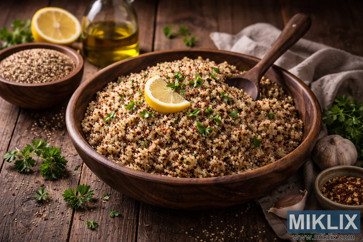 ஆலிவ் எண்ணெய், பூண்டு, எலுமிச்சை மற்றும் மூலிகைகளால் சூழப்பட்ட, ஒரு பழமையான மேஜையில் ஒரு மரக் கிண்ணத்தில் அழகாக வழங்கப்பட்ட குயினோவாவின் உயர் தெளிவுத்திறன் புகைப்படம்.