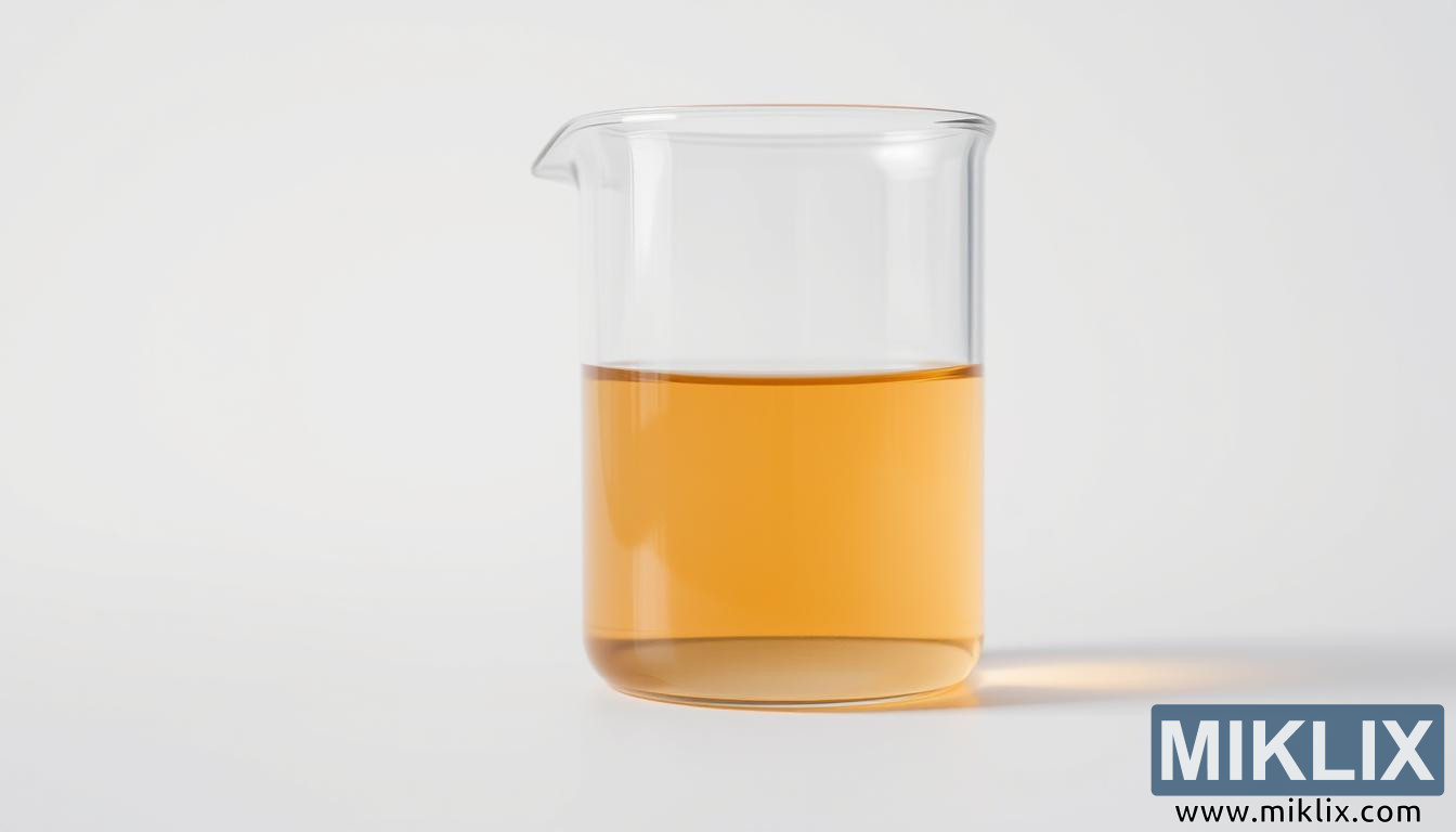வெள்ளைப் பின்னணியில் சற்று அம்பர் நிற திரவத்தால் நிரப்பப்பட்ட ஒரு தெளிவான கண்ணாடி பீக்கர், சுத்தமான, குறைந்தபட்ச ஆய்வக அழகியலை எடுத்துக்காட்டுகிறது.