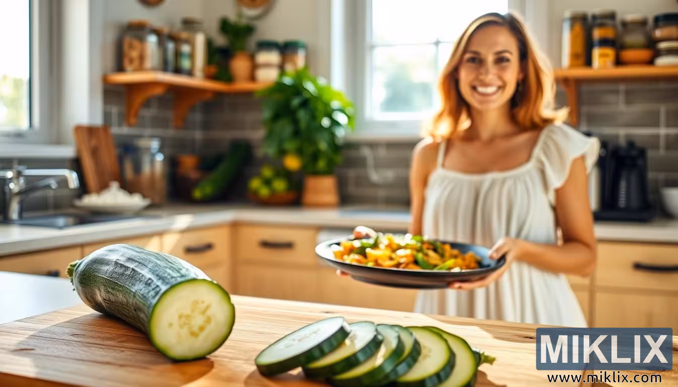 வெயிலில் ஒளிரும் சமையலறையில் வெட்டப்பட்ட சீமை சுரைக்காய், சிரிக்கும் பெண் ஒருவர் சுரைக்காய் பாத்திரங்களை கையில் ஏந்தி நிற்கிறார், இது சமநிலை, உயிர்ச்சக்தி மற்றும் எடை இழப்பில் சீமை சுரைக்காயின் பங்கைக் குறிக்கிறது.