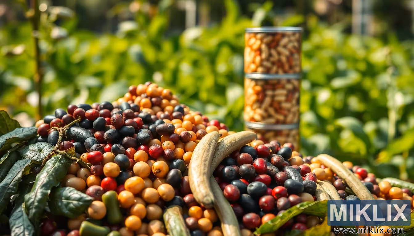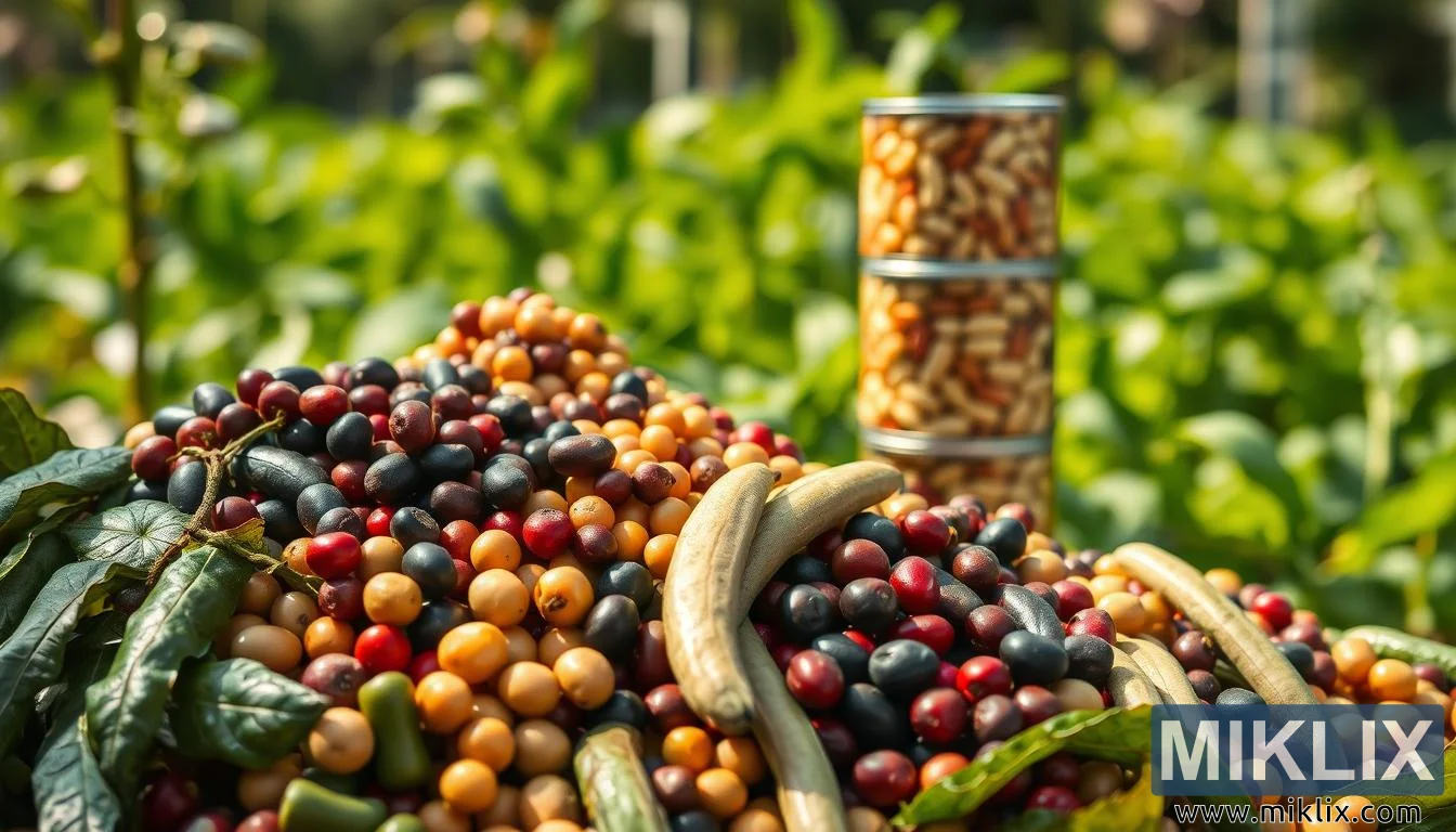 பசுமையான பண்ணை காட்சிக்கு ஏற்ப புதிய பீன்ஸ் வகைகளுடன் கூடிய பதிவு செய்யப்பட்ட பீன்ஸ், பீன்ஸை நிலையான, சத்தான மற்றும் செலவு குறைந்த புரத மூலமாக எடுத்துக்காட்டுகிறது.