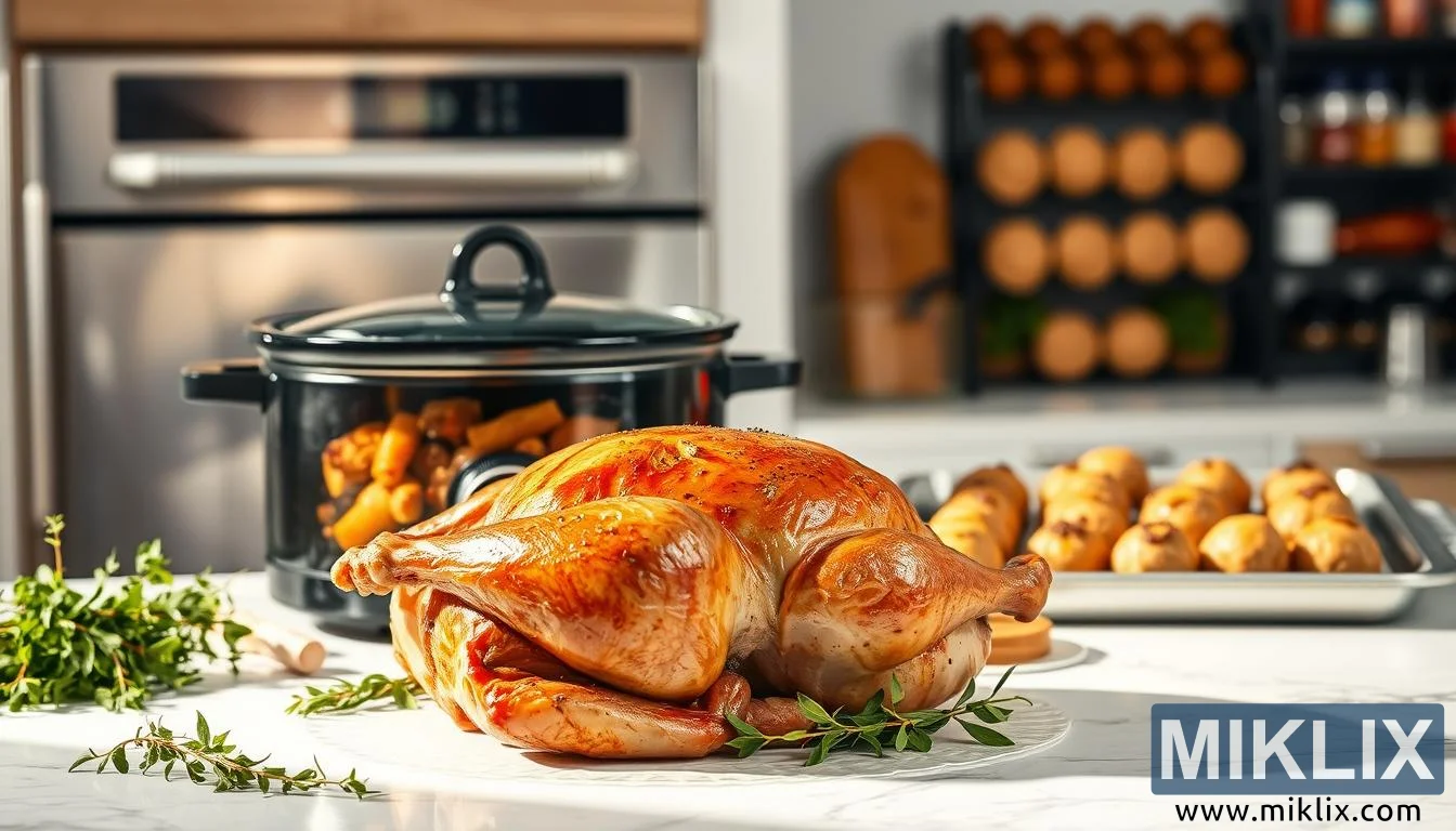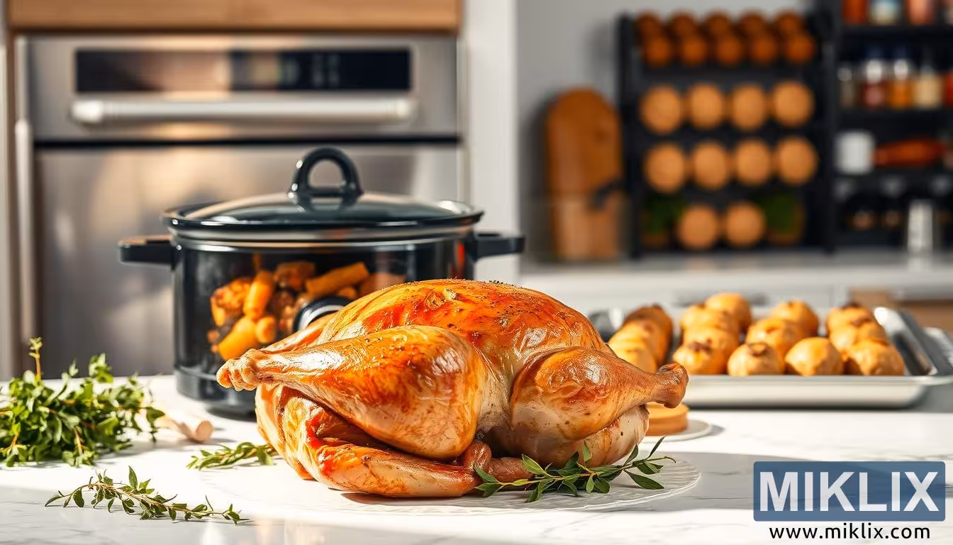 வான்கோழியின் பின்னால், நடுவில், ஒரு நேர்த்தியான கருப்பு மெதுவான குக்கர் அமர்ந்திருக்கிறது, அதன் மூடி சுற்றியுள்ள ஒளியை ஓரளவு பிரதிபலிக்கிறது. அதற்குள், ஒரு இதயமான வான்கோழி குழம்பு மெதுவாக கொதிக்கிறது, கேரட் போன்ற காய்கறிகளின் தெரியும் துண்டுகளால் நிரம்பியுள்ளது, அவை வரவேற்கத்தக்க வகையில் வெளியே எட்டிப் பார்க்கின்றன. வான்கோழி வறுக்க மட்டுமல்ல, வீட்டிற்கு சுவையான நறுமணத்தை அளிக்கும் ஆறுதலான, மெதுவாக சமைக்கப்பட்ட உணவுகளுக்கும் ஏற்றது என்பதை பார்வையாளருக்கு நினைவூட்டுகிறது. இந்த விவரம் பல்துறை உணர்வை மேம்படுத்துகிறது, வான்கோழி ஒரு பண்டிகை வறுவலில் இருந்து உடலையும் ஆன்மாவையும் சூடேற்றும் ஒரு ஊட்டமளிக்கும் வார நாள் உணவாக எவ்வாறு மாற்றியமைக்க முடியும் என்பதை நிரூபிக்கிறது. நவீன மற்றும் நடைமுறைக்குரிய மெதுவான குக்கர் தானே, சமையலறையை அன்றாட யதார்த்தத்தில் நங்கூரமிடுகிறது, ஆரோக்கியமான உணவை வசதி மற்றும் பாரம்பரியத்துடன் அடைய முடியும் என்பதைக் காட்டுகிறது.