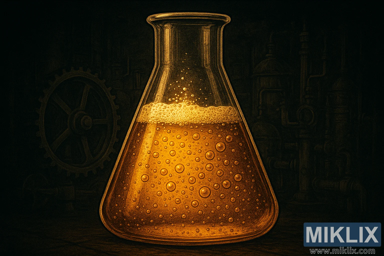 தங்க நிற, உமிழும் திரவத்தால் ஒளிரும் எர்லென்மேயர் குடுவையின் பழங்காலத்தால் ஈர்க்கப்பட்ட விளக்கம். கியர்கள் மற்றும் குழாய்களின் இருண்ட தொழில்துறை பின்னணியில் அமைக்கப்பட்ட இது, ஈஸ்ட் காய்ச்சுவதில் மது சகிப்புத்தன்மையைக் குறிக்கிறது.