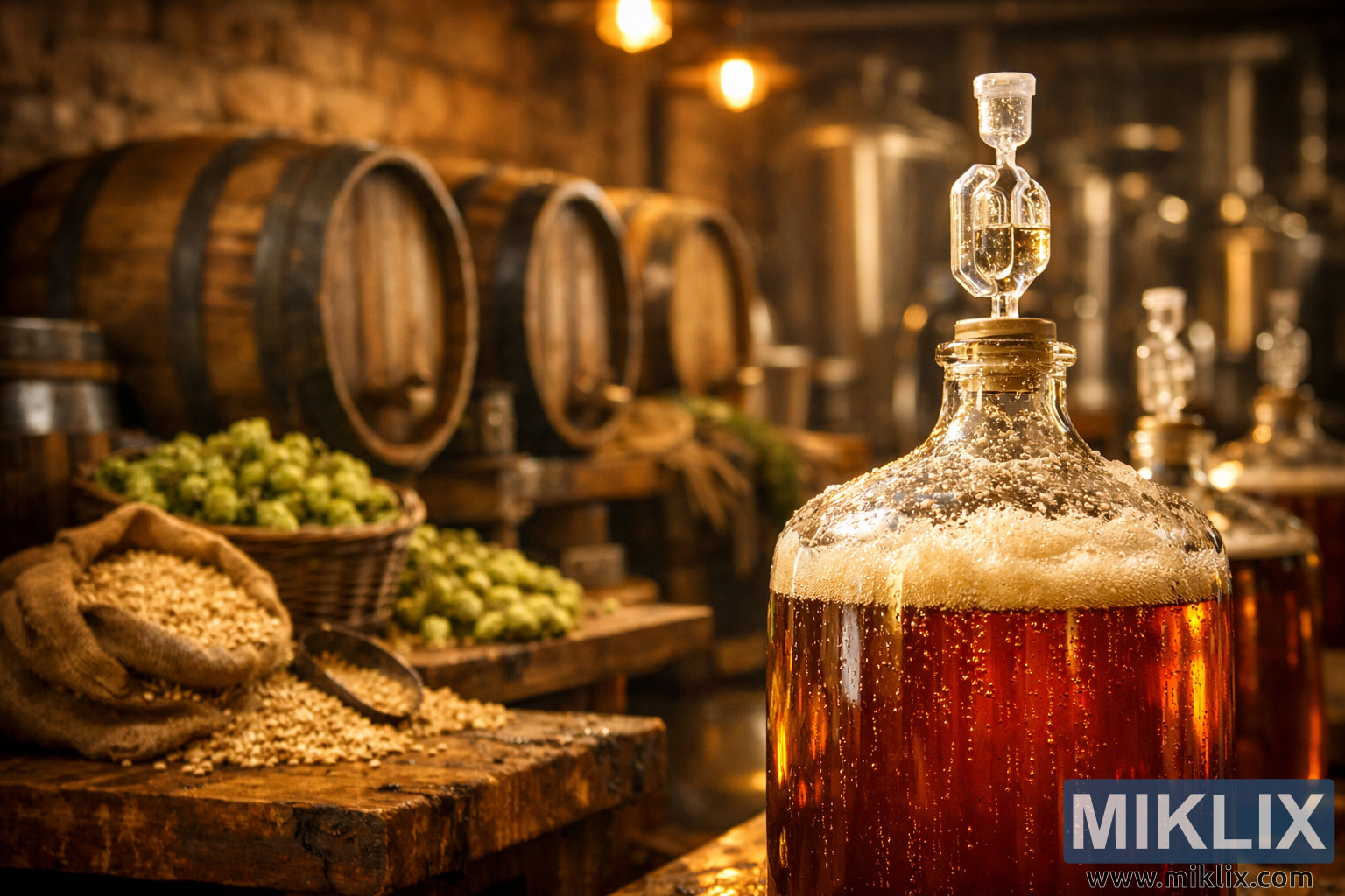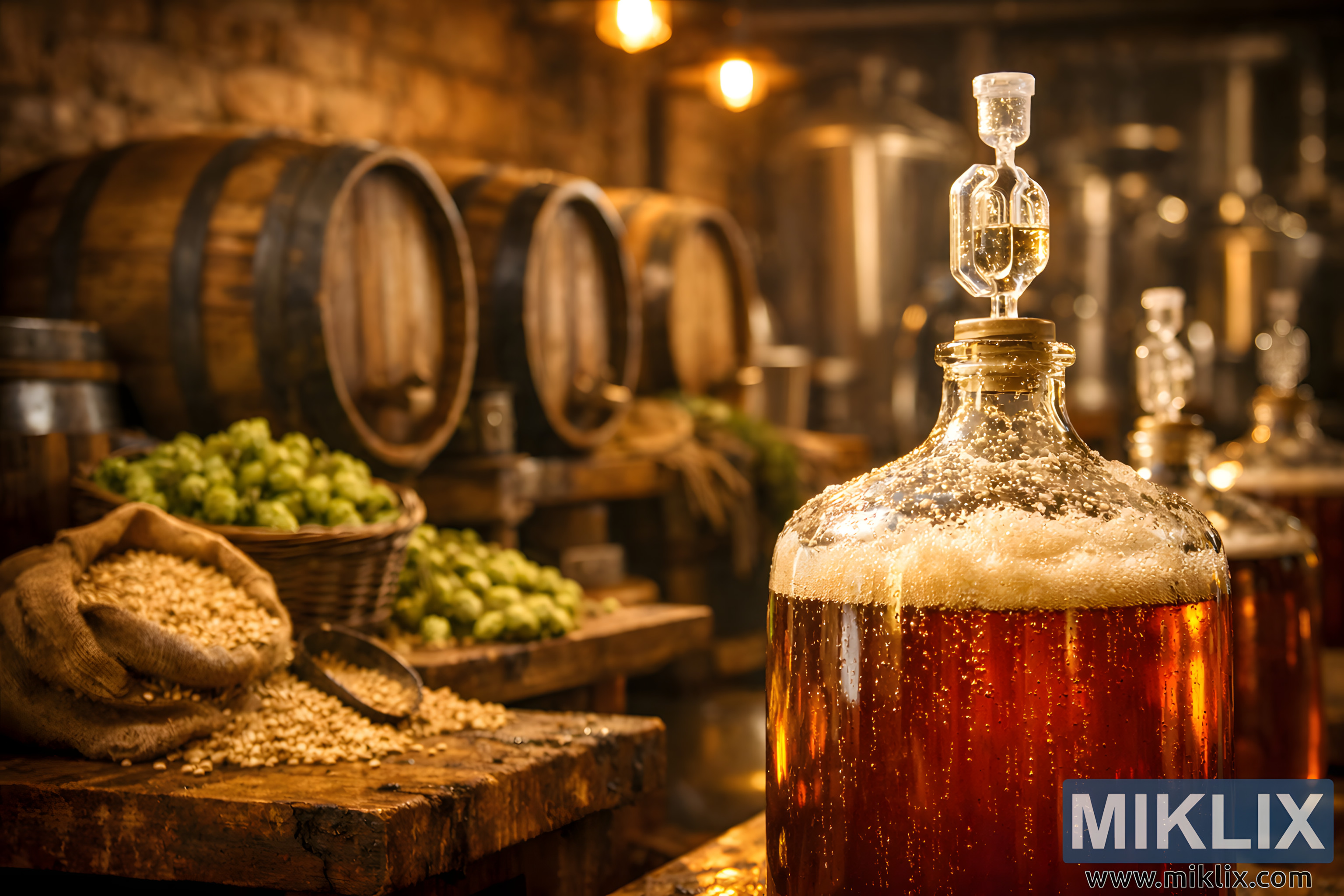 Golden Stillness: Beer Fermentation in a Rustic Cellar