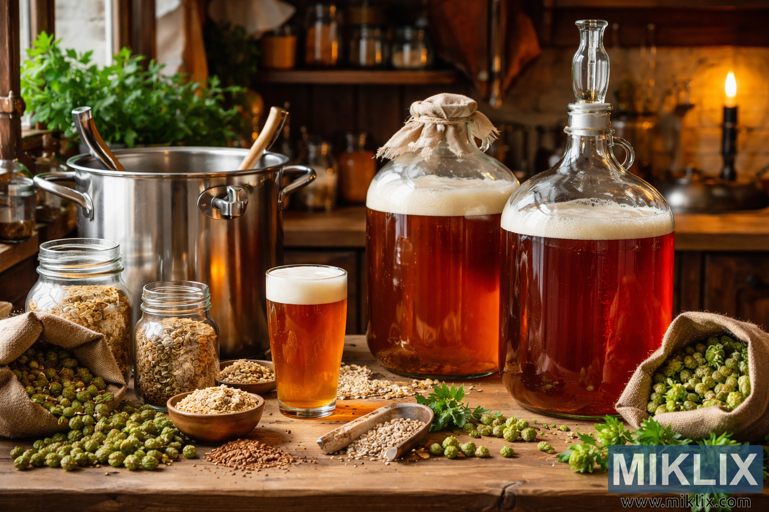 கண்ணாடி கார்பாய்களில் புளிக்கவைக்கும் ஏல், புதிய ஹாப்ஸ், தானியங்கள், காய்ச்சும் கருவிகள் மற்றும் ஒரு சூடான, கைவினைஞர் சமையலறை சூழலைக் கொண்ட ஒரு பழமையான வீட்டில் காய்ச்சும் அமைப்பின் உயர் தெளிவுத்திறன் படம்.