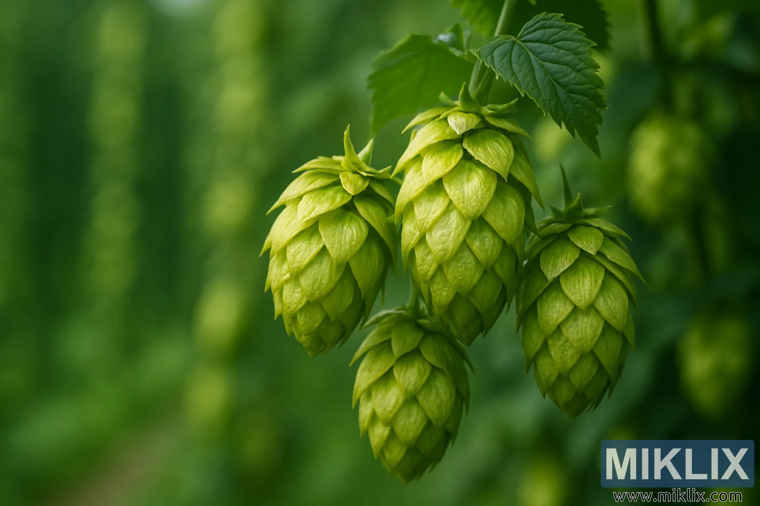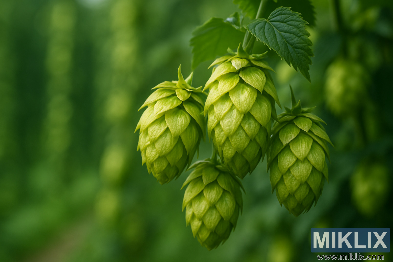 நடுப்பகுதி இலைகள் மற்றும் உயரமான, பின்னோக்கிச் செல்லும் ஹாப் மரங்களின் அலை அலையாக மங்கலாகி, செழிப்பான ஹாப் முற்றத்தின் ஆழத்தையும் மிகுதியையும் குறிக்கிறது. இந்த உயர்ந்த தாவரங்களின் வரிசைகள் பின்னணியில் மெதுவாக மங்கி, அவற்றின் மறுபயன்பாடு கிட்டத்தட்ட கனவு போன்ற தாளத்தை உருவாக்குகிறது. பசுமையானது பசுமையானது, சட்டகத்தை உயிர்ப்பால் நிரப்புகிறது மற்றும் அமைதியான தோட்டத்தின் நடுவில் நிற்கும் உணர்வைத் தூண்டுகிறது, இலைகளின் சலசலப்பு மற்றும் காற்றில் பிசினின் மங்கலான வாசனையால் சூழப்பட்டுள்ளது. மங்கலான பின்னணி முன்புறத்தில் உள்ள ஹாப்ஸ் மீது கவனத்தை உறுதியாக செலுத்துகிறது, ஆனால் இது சூழலையும் சேர்க்கிறது, இந்த கூம்புகள் ஒரு பெரிய முழுமையின் ஒரு பகுதியாகும் என்பதை பார்வையாளருக்கு நினைவூட்டுகிறது - கவனமாக சாகுபடி, பருவகால தாளங்கள் மற்றும் இந்த குறிப்பிட்ட வகையின் நுணுக்கங்களைப் புரிந்துகொள்ளும் விவசாயிகளின் அர்ப்பணிப்பு மூலம் வளர்க்கப்படும் அறுவடை.