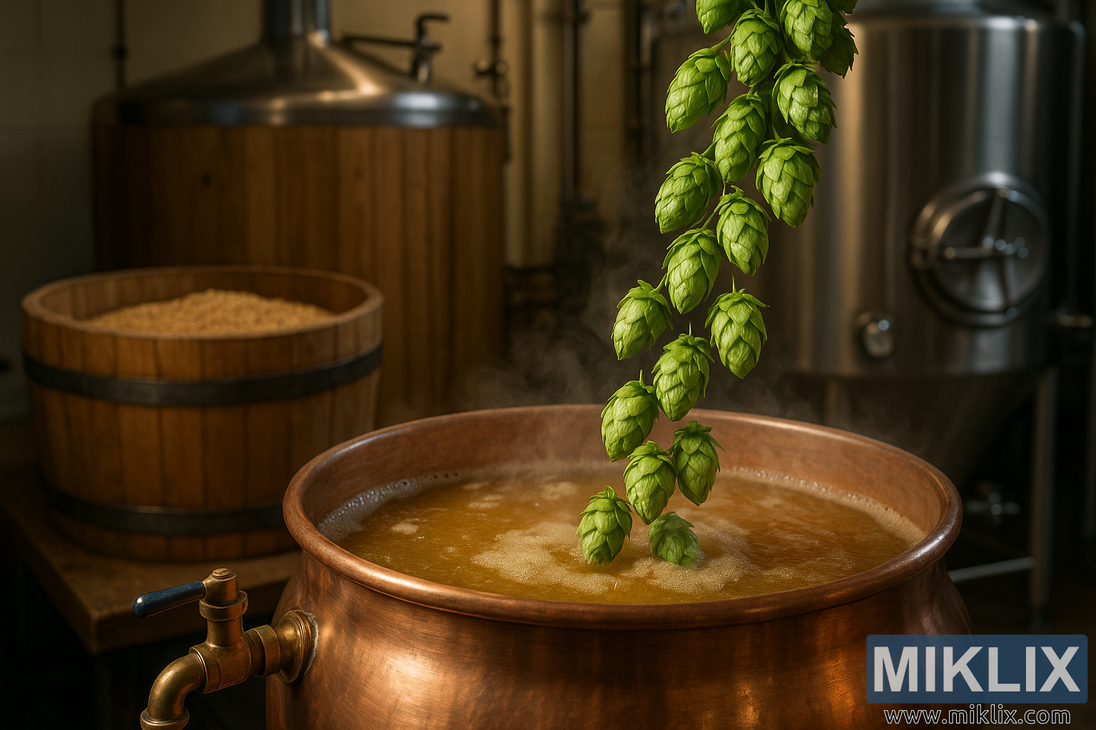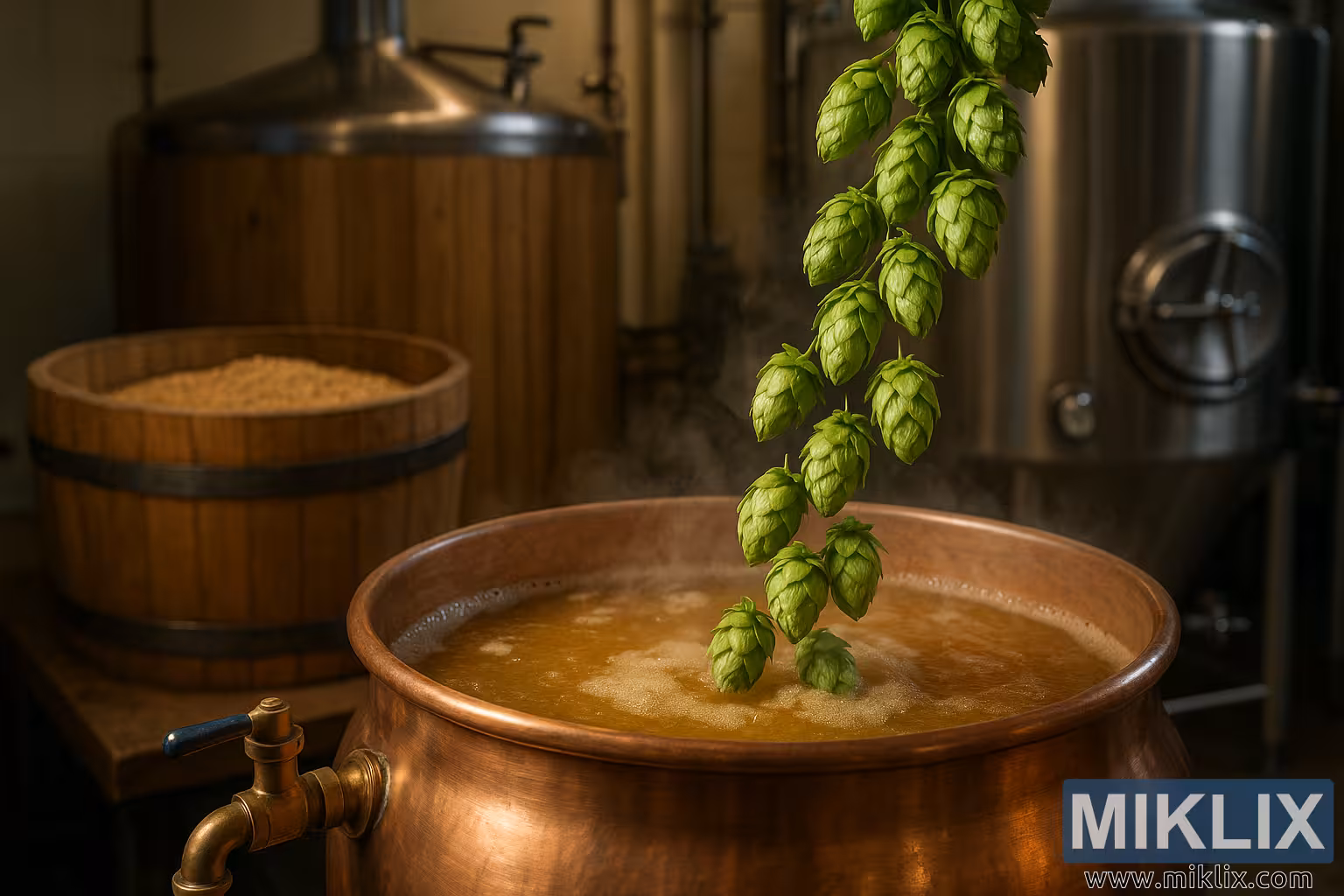 கெட்டிலுக்குப் பின்னால், இந்தக் கைவினைச் செயல்முறையின் பிற கூறுகளை வெளிப்படுத்த காட்சி விரிவடைகிறது. ஒருபுறம் ஒரு தடிமனான மர மாஷ் டன் உள்ளது, அதன் திறந்த மேற்புறம் புதிதாக அரைக்கப்பட்ட தானியங்களால் நிரம்பியுள்ளது. அரைக்கப்பட்டு தயாராக இருக்கும் வெளிர் மால்ட், உடல் மற்றும் இனிமையின் அடித்தளமாக அதன் பங்கை எதிர்பார்த்து அமர்ந்திருக்கிறது, அதன் எளிய வடிவம் கொதிக்கும் வோர்ட்டின் மாறும் ஆற்றலுடன் வேறுபடுகிறது. அதன் இருண்ட உலோக வளையங்களுடன் கூடிய பாத்திரத்தின் மரம், பாரம்பரியம் மற்றும் தொடர்ச்சியைப் பேசுகிறது, நவீன எஃகு மற்றும் ஆட்டோமேஷனுக்கு முந்தைய பல நூற்றாண்டுகளின் காய்ச்சும் நடைமுறைகளை எதிரொலிக்கிறது. நடுவில் அதன் இடம் கடந்த காலத்தையும் நிகழ்காலத்தையும் இணைக்கிறது, காய்ச்சும் ஒரு விவசாய மற்றும் கலாச்சார கைவினை, அறிவியலைப் போலவே சடங்கிலும் ஆழமாக வேரூன்றியுள்ளது என்பதை அமைதியான நினைவூட்டலாக நிற்கிறது.