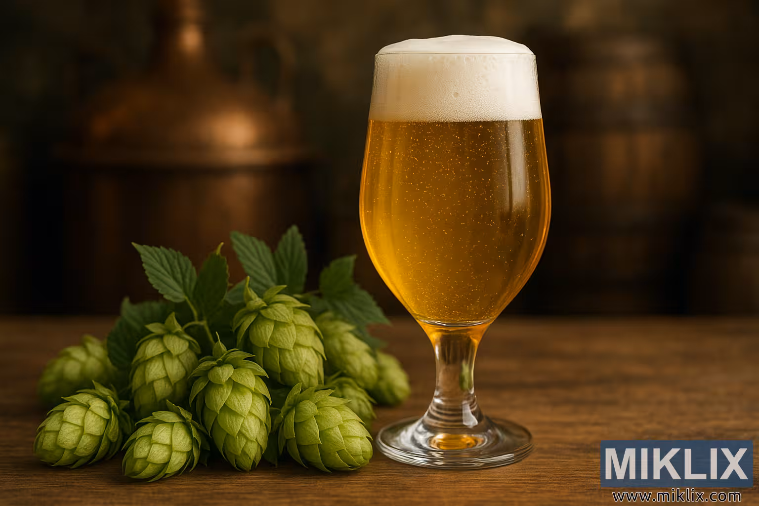 பாரம்பரியம் மற்றும் கைவினைத்திறனைக் குறிக்கும் வகையில், பின்னணியில் செப்பு கெட்டில்கள் மற்றும் பீப்பாய்களுடன், புதிய சாஸ் ஹாப்ஸால் சூழப்பட்ட செக் பாணி லாகரின் நேர்த்தியான கண்ணாடி.