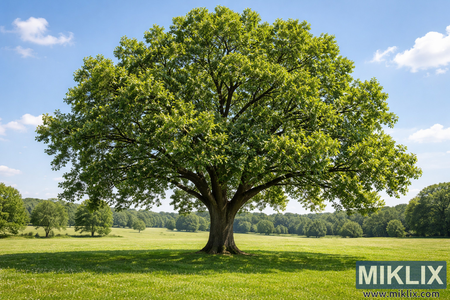 முழு வெயிலில் அதிக இடவசதியுடன் வளரும் முதிர்ந்த வால்நட் மரத்தின் உயர் தெளிவுத்திறன் கொண்ட நிலப்பரப்பு படம், ஆரோக்கியமான மர வளர்ச்சிக்கு ஏற்ற நிலைமைகளை நிரூபிக்கிறது.