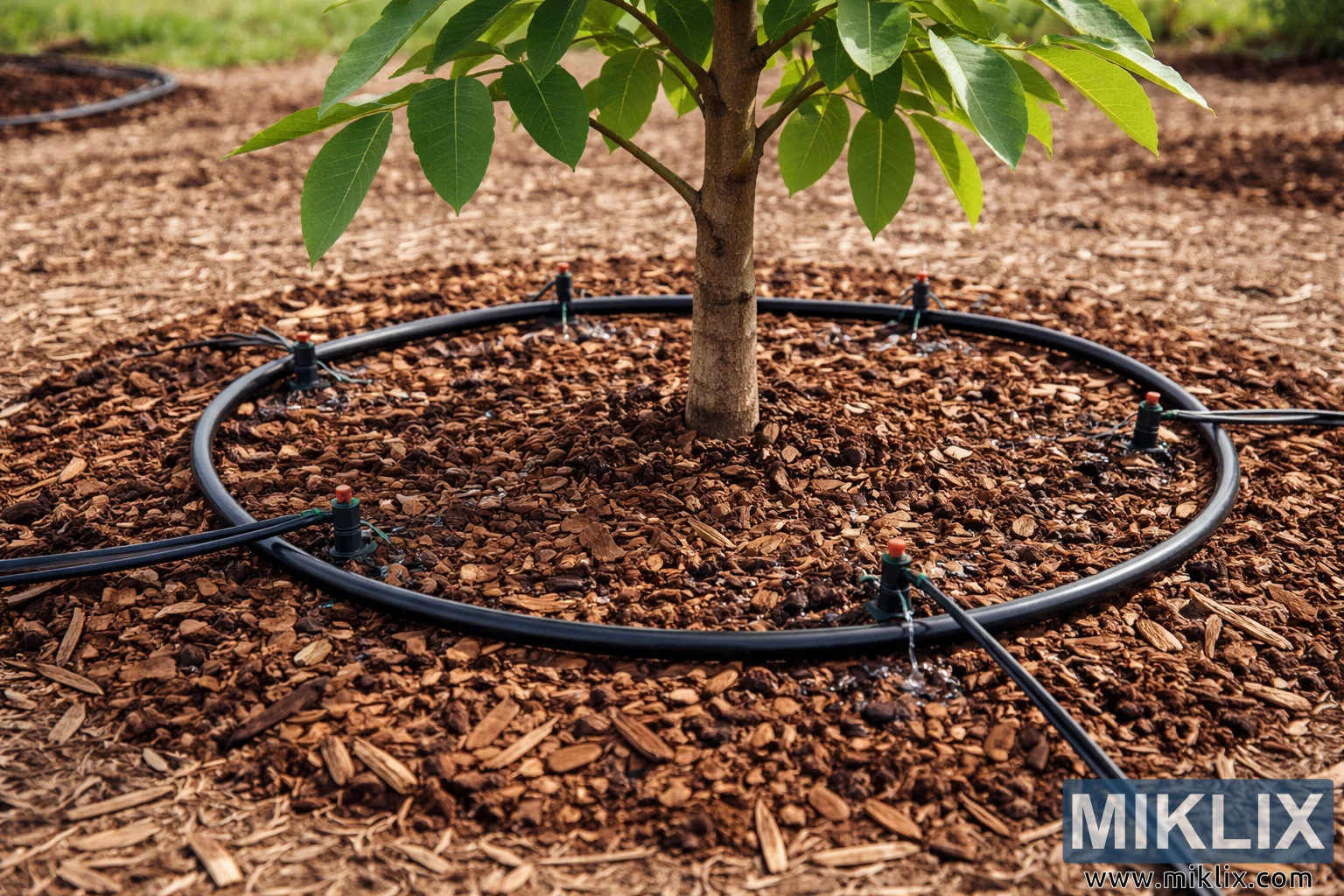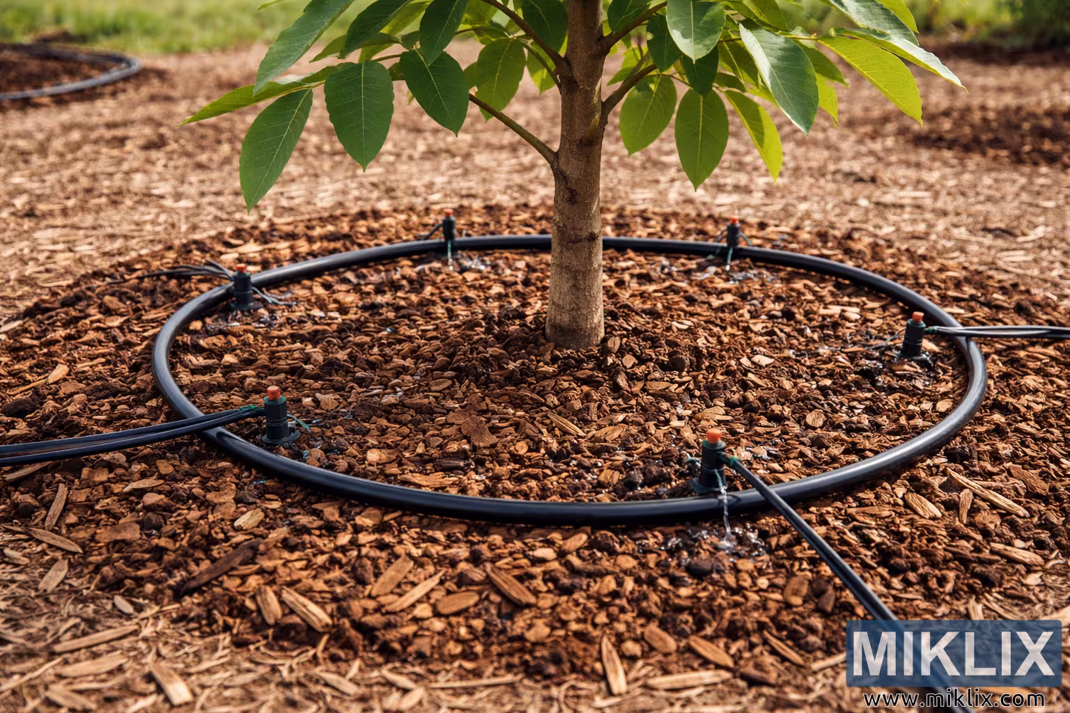 நன்கு பராமரிக்கப்பட்ட தோட்டம் அல்லது பழத்தோட்ட அமைப்பில், கருப்பு குழாய்கள், தெரியும் உமிழ்ப்பான்கள் மற்றும் தழைக்கூளம் பூசப்பட்ட மரத்தின் அடிப்பகுதியுடன், இளம் வால்நட் மரத்திற்கு தண்ணீரை வழங்கும் சொட்டு நீர் பாசன அமைப்பின் உயர் தெளிவுத்திறன் படம்.