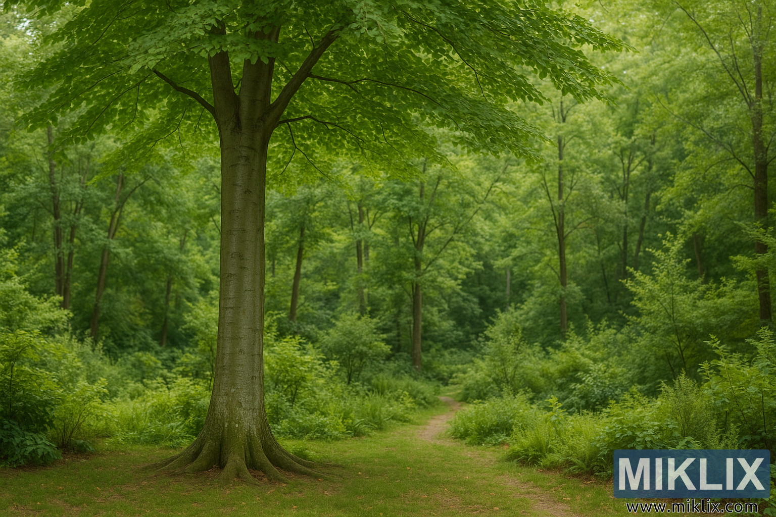 சாம்பல் நிற பட்டை, அகன்ற பச்சை விதானம் மற்றும் விரிந்த வேர்களைக் கொண்ட ஒரு கம்பீரமான அமெரிக்க பீச் மரம் ஒரு வனப்பகுதிப் பாதையில் நிழலையும் இயற்கை அழகையும் வழங்குகிறது.
