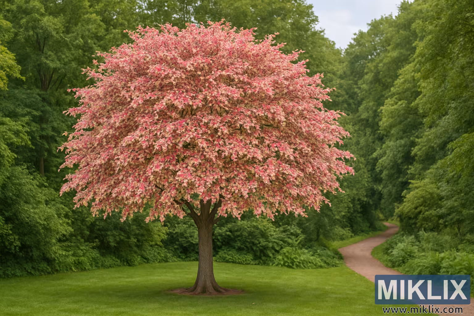 மூவர்ண பீச்சைச் சுற்றிலும் பசுமையான கடல் உள்ளது, இது காட்சியை வடிவமைக்கும் வனப்பகுதியின் விளிம்பால் வழங்கப்படுகிறது. சாதாரண இலைகளின் அடர்த்தியான பின்னணி பீச்சின் நிறத்தின் நாடகத்தை மட்டுமே உயர்த்துகிறது, இது மரம் வெல்வெட்டிற்கு எதிராக ஒரு ரத்தினத்தைப் போல முன்னோக்கி நிற்க அனுமதிக்கிறது. வண்ணமயமான இளஞ்சிவப்பு மற்றும் வெள்ளை நிறங்களுடன் செழிப்பான பச்சை நிறங்களின் இந்த இணைப்பு ஆழம் மற்றும் செறிவூட்டலின் உணர்வை மேம்படுத்துகிறது, இதனால் மரம் கிட்டத்தட்ட ஒளிரும். தூரத்திற்கு மெதுவாக வளைந்திருக்கும் வளைந்த தோட்டப் பாதை, பார்வை மற்றும் கதை இரண்டையும் சேர்க்கிறது, நிலப்பரப்பின் வழியாக இயக்கத்தை பரிந்துரைக்கிறது, விதானத்தின் அடியிலும் அதற்கு அப்பாலும் வனப்பகுதியின் நிழலான இடைவெளிகளுக்குள் நிதானமாக நடக்க அழைப்பது போல.