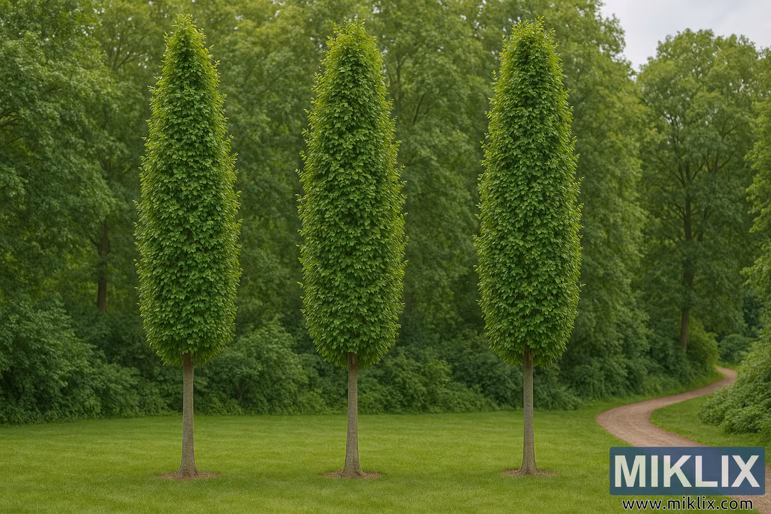ஒவ்வொரு மரத்தின் அடர்த்தியான விதானமும் துடிப்பான இலைகளால் நிரம்பியுள்ளது, அவற்றின் பளபளப்பான மேற்பரப்புகள் பச்சை நிறத்தில் மாறி மாறி ஒளியைப் பிடித்து பிரதிபலிக்கின்றன. இது அவற்றின் வடிவத்தின் உறுதியான வடிவவியலை மென்மையாக்கும் ஒரு அமைப்பு மேற்பரப்பை உருவாக்குகிறது, மரங்கள் பழக்கத்தில் முறையாக இருக்கும்போது, அவை உயிர்ச்சக்தியையும் செழுமையையும் வெளிப்படுத்துகின்றன. ஒன்றாகப் பார்க்கும்போது, மூன்று நெடுவரிசைகளும் ஒரு தாள வரிசையை உருவாக்குகின்றன, கிட்டத்தட்ட புல்வெளியின் விளிம்பில் காவலாளியாக நிற்கும் காவலாளிகளின் ஊர்வலம் போன்றவை. அவற்றின் இருப்பிடம் நடைமுறை மற்றும் அழகியல் பரிசீலனைகள் இரண்டையும் பரிந்துரைக்கிறது, ஏனெனில் அவை வனப்பகுதி பின்னணியில் வளைந்து செல்லும் மென்மையான வளைந்த தோட்டப் பாதையை நோக்கிய காட்சியை வடிவமைக்கின்றன. பாதையின் மென்மையான வளைவு மரங்களின் செங்குத்து கண்டிப்புடன் வேறுபடுகிறது, ஓட்டம் மற்றும் இயக்க உணர்வுடன் நிலப்பரப்பை சமநிலைப்படுத்துகிறது.