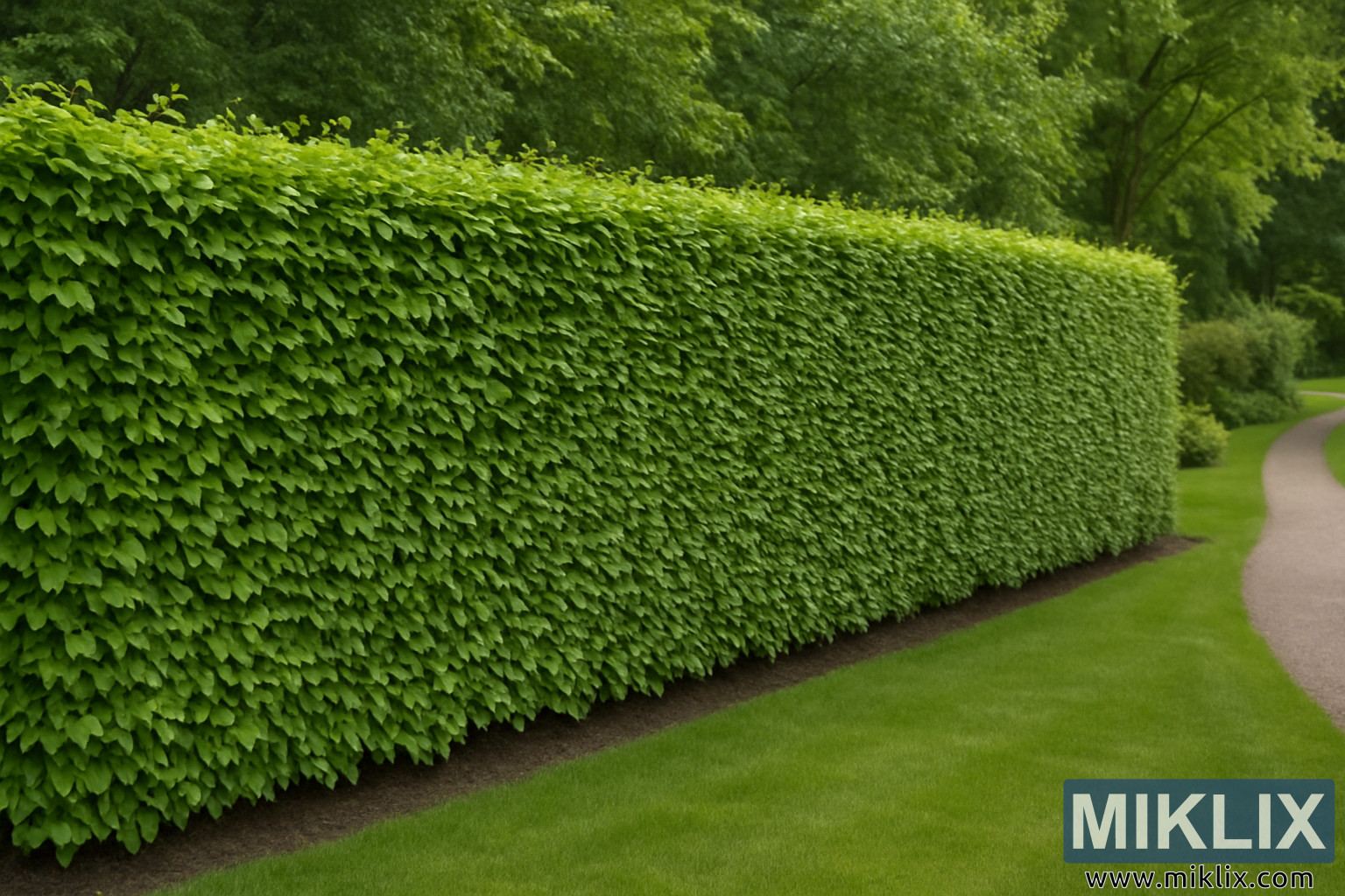 இந்தப் படம், குறைபாடற்ற முறையில் பராமரிக்கப்படும் பீச் மர வேலியை (ஃபேகஸ் சில்வாடிகா) காட்டுகிறது. இது, கட்டமைக்கப்பட்ட தோட்ட வடிவமைப்பில் இந்த இனத்தின் பல்துறைத்திறன் மற்றும் நேர்த்திக்கு ஒரு உயிருள்ள சான்றாக நிற்கிறது. அழகுபடுத்தப்பட்ட புல்வெளியின் விளிம்பில் நீண்டு, மெதுவாக வளைந்த பாதையை ஒட்டி, இந்த வேலி, பசுமையான, துடிப்பான பச்சை இலைகளின் தடையற்ற சுவரை உருவாக்குகிறது, இது துல்லியமாக வெட்டப்பட்டு, மிருதுவான கோடுகள் மற்றும் ஒரு முழுமையான சீரான மேற்பரப்பை உருவாக்குகிறது. ஒவ்வொரு இலையும் அடர்த்தியான வெகுஜனத்திற்கு பங்களிக்கிறது, இடைவெளிகளை நீக்கி, பீச் வேலிகளை மிகவும் போற்றும் திடமான, கட்டடக்கலை விளைவை அடைய செதில்களைப் போல ஒன்றுடன் ஒன்று சேர்கிறது. ஒரே நேரத்தில் நடைமுறை மற்றும் அலங்காரமாக, இது ஒரு இயற்கை எல்லையாக அதன் பங்கை நிறைவேற்றுகிறது, அதே நேரத்தில் முழு நிலப்பரப்பையும் உயர்த்தும் ஒரு குறிப்பிடத்தக்க வடிவமைப்பு அம்சமாகவும் செயல்படுகிறது.