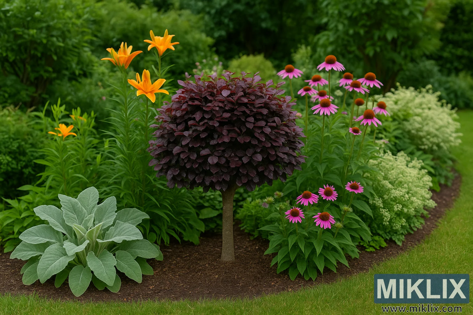 குள்ள ஊதா நிற பீச், கலப்பு எல்லைகளில் அமைப்பு மற்றும் தைரியமான மாறுபாட்டைச் சேர்க்கிறது, வெள்ளி இலைகள், அல்லிகள் மற்றும் கூம்புப் பூக்களைப் பூர்த்தி செய்கிறது.