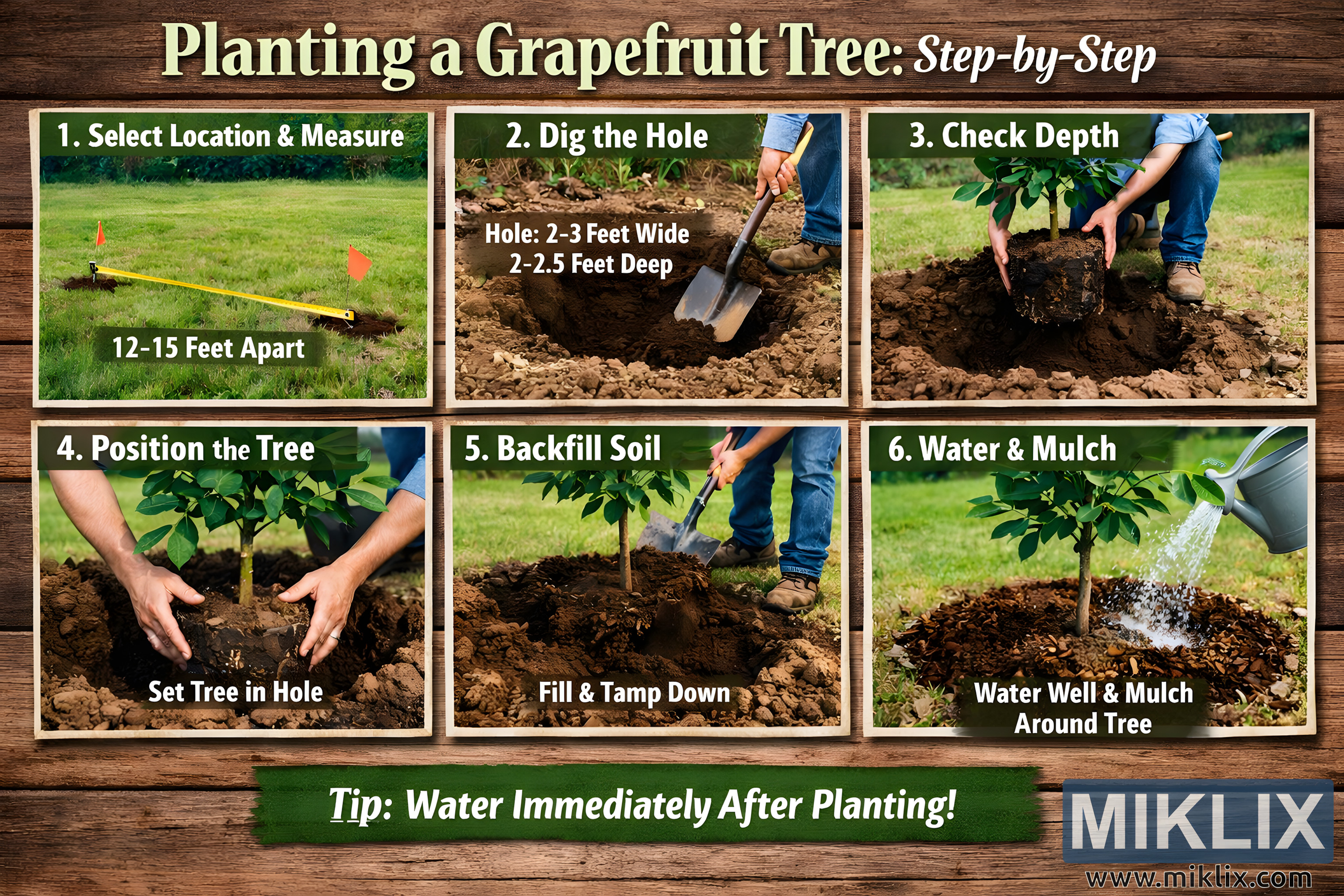இந்தப் படம் ஒரு பரந்த, நிலப்பரப்பு சார்ந்த அறிவுறுத்தல் படத்தொகுப்பாகும், இது ஒரு திராட்சைப்பழ மரத்தை நடுவதற்கான படிப்படியான செயல்முறையை சரியான ஆழம் மற்றும் இடைவெளியுடன் காட்சிப்படுத்துகிறது. ஒட்டுமொத்த வடிவமைப்பு ஒரு தோட்டக்கலை வழிகாட்டி அல்லது கல்வி சுவரொட்டியை ஒத்திருக்கிறது, இது முழு அமைப்பையும் வடிவமைக்கும் ஒரு சூடான, பழமையான மர பின்னணியில் அமைக்கப்பட்டுள்ளது. மேலே, ஒரு தடிமனான தலைப்பு "திராட்சைப்பழ மரத்தை நடுதல்: படிப்படியாக" என்று பச்சை மற்றும் வெள்ளை எழுத்துக்களைப் பயன்படுத்தி, இயற்கையான, தோட்டக்கலை கருப்பொருளை வலுப்படுத்துகிறது. தலைப்புக்குக் கீழே, படம் மூன்று வரிசைகளில் அமைக்கப்பட்ட ஆறு தெளிவாக பெயரிடப்பட்ட பேனல்களாகப் பிரிக்கப்பட்டுள்ளது, ஒவ்வொரு பேனலும் நடவு செயல்முறையின் ஒரு தனித்துவமான கட்டத்தைக் குறிக்கிறது. "இடத்தைத் தேர்ந்தெடு & அளவிடு" என்று தலைப்பிடப்பட்ட முதல் பேனல், இரண்டு குறிக்கப்பட்ட புள்ளிகளுக்கு இடையில் தரையில் நீட்டிக்கப்பட்ட ஒரு அளவிடும் நாடாவுடன் ஒரு புல்வெளி முற்றத்தைக் காட்டுகிறது, இது மரங்களுக்கு இடையில் 12–15 அடி பரிந்துரைக்கப்பட்ட இடைவெளியைக் குறிக்கிறது. சிறிய கொடிகள் அல்லது குறிப்பான்கள் சரியான இடம் மற்றும் தூரத்தை வலியுறுத்துகின்றன. இரண்டாவது பேனல், "துளை தோண்டி", ஒரு நபர் மண்வெட்டியைப் பயன்படுத்தி வளமான பழுப்பு நிற மண்ணைத் தோண்டுவதை சித்தரிக்கிறது. படத்தில் பதிக்கப்பட்டுள்ள வாசகம், தோராயமாக 2–3 அடி அகலமும் 2–2.5 அடி ஆழமும் கொண்ட, சிறந்த துளை அளவைக் குறிப்பிடுகிறது, இது நடவு செய்வதற்கு முன் சரியான தயாரிப்பை வலுப்படுத்துகிறது. மூன்றாவது பலகம், "ஆழத்தைச் சரிபார்க்கவும்", கைகள் ஒரு இளம் திராட்சைப்பழ மரத்தை அதன் வேர் பந்தை துளைக்குள் கவனமாகக் குறைப்பதைக் காட்டுகிறது, மரம் மண்ணின் மேற்பரப்புடன் ஒப்பிடும்போது சரியான ஆழத்தில் அமர்ந்திருப்பதை உறுதி செய்வதன் முக்கியத்துவத்தை எடுத்துக்காட்டுகிறது. நான்காவது பலகமான "மரத்தை நிலைநிறுத்து" இல், மரக்கன்று துளையில் நிமிர்ந்து மையப்படுத்தப்பட்டுள்ளது, கைகள் அதன் நிலையை சரிசெய்து தண்டு நேராகவும் நிலையானதாகவும் இருக்கும். ஐந்தாவது பலகம், "பேக்ஃபில் சோயில்", மரத்தைச் சுற்றியுள்ள துளைக்குள் மண் மீண்டும் திணிக்கப்பட்டு, காற்றுப் பைகளை அகற்றி வேர்களைப் பாதுகாக்க பூமியைத் தட்டுவதை விளக்குகிறது. ஆறாவது மற்றும் இறுதி பலகமான "தண்ணீர் & தழைக்கூளம்", புதிதாக நடப்பட்ட மரத்திற்கு நீர்ப்பாசன கேனைப் பயன்படுத்தி தாராளமாக தண்ணீர் ஊற்றப்படுவதைக் காட்டுகிறது, அதே நேரத்தில் ஈரப்பதத்தைத் தக்கவைத்து மண்ணைப் பாதுக