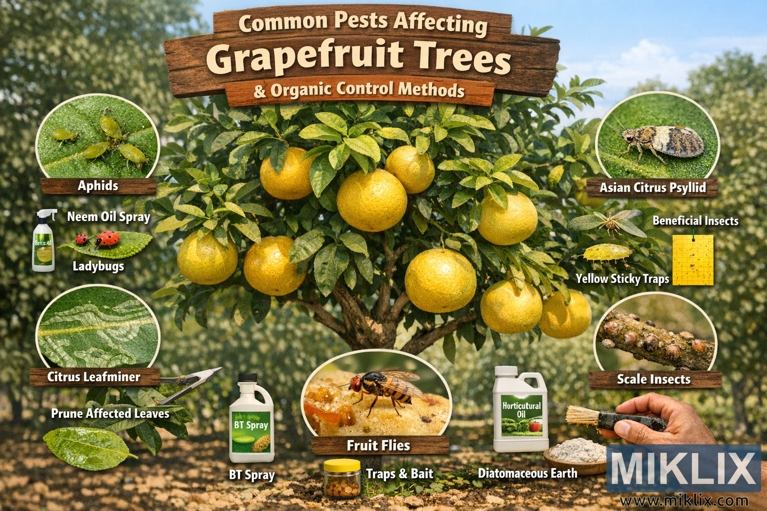 படத்தின் மேற்புறத்தில், "திராட்சை மரங்களைப் பாதிக்கும் பொதுவான பூச்சிகள் & கரிம கட்டுப்பாட்டு முறைகள்" என்ற தலைப்பில் ஒரு பழமையான மரப் பலகை காட்டப்பட்டுள்ளது, இது கல்வி மற்றும் கரிம தோட்டக்கலை கருப்பொருளை வலுப்படுத்துகிறது. மைய மரத்தைச் சுற்றி பல வட்ட வடிவ படங்கள் செருகப்பட்டுள்ளன, ஒவ்வொன்றும் சிட்ரஸ் மரங்களில் பொதுவாகக் காணப்படும் ஒரு குறிப்பிட்ட பூச்சியை எடுத்துக்காட்டுகின்றன. இந்த நெருக்கமான புகைப்படங்கள் பரந்த பழத்தோட்டக் காட்சியுடன் வேறுபடுகின்றன, இதனால் பூச்சிகளை எளிதாக அடையாளம் காணலாம்.