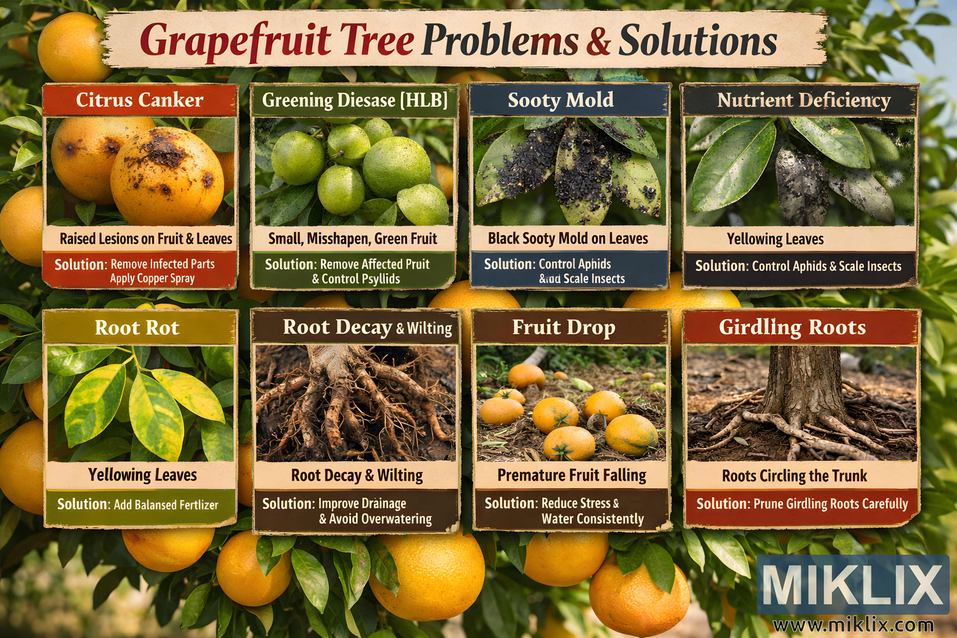 இந்தப் படம், தோட்டக்காரர்கள் மற்றும் சிட்ரஸ் விவசாயிகளுக்கான காட்சி வழிகாட்டியாக வடிவமைக்கப்பட்ட "திராட்சைப்பழ மரப் பிரச்சனைகள் & தீர்வுகள்" என்ற தலைப்பில் பரந்த, நிலப்பரப்பு சார்ந்த கல்வி விளக்கப்படமாகும். பின்னணி பளபளப்பான பச்சை இலைகள் மற்றும் பழுத்த மஞ்சள்-ஆரஞ்சு திராட்சைப்பழங்களின் கொத்துகளால் நிரப்பப்பட்ட ஒரு ஆரோக்கியமான திராட்சைப்பழ மரத்தைக் காட்டுகிறது, இது ஒரு இயற்கையான பழத்தோட்ட அமைப்பை உருவாக்குகிறது. இந்தப் பின்னணியில், விளக்கப்படம் இரண்டு கிடைமட்ட வரிசைகளில் அமைக்கப்பட்ட எட்டு செவ்வக பேனல்களின் சுத்தமான கட்டமாக ஒழுங்கமைக்கப்பட்டுள்ளது, ஒவ்வொரு பேனலும் ஒரு குறிப்பிட்ட திராட்சைப்பழ மரப் பிரச்சனையை எடுத்துக்காட்டுகிறது, அதனுடன் ஒரு தெளிவான புகைப்பட உதாரணம் மற்றும் ஒரு சுருக்கமான தீர்வும் உள்ளது.