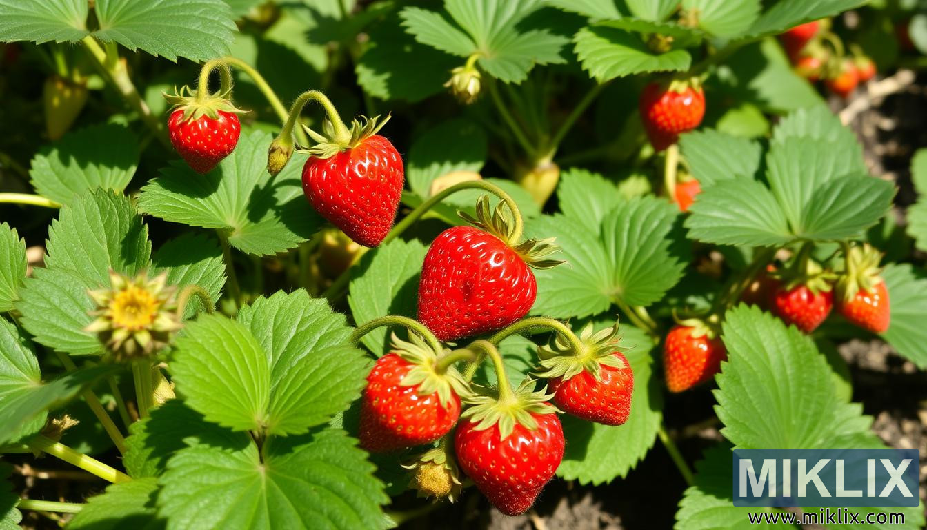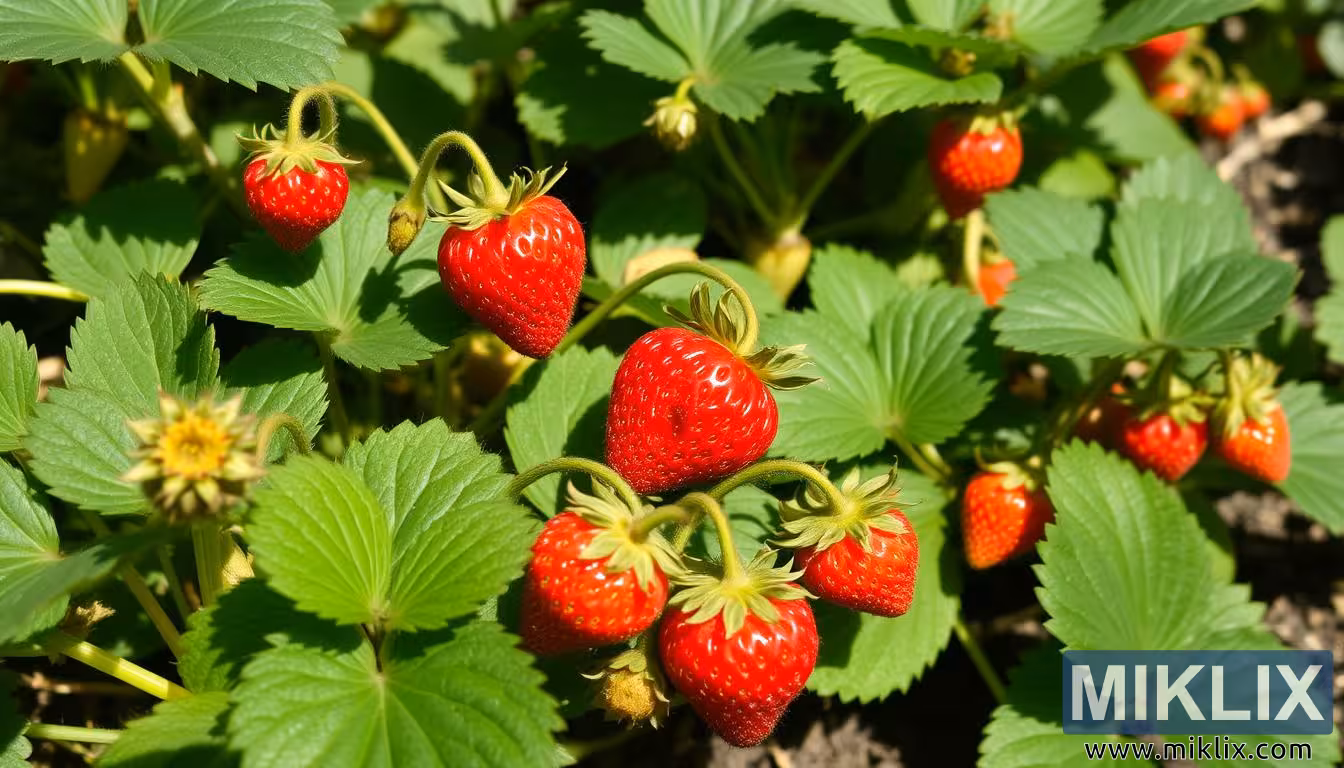 பிரகாசமான சிவப்பு, பளபளப்பான ஸ்ட்ராபெர்ரிகள் ஒரு பசுமையான செடியில் தொங்கும், பழுக்காத பழங்கள் மற்றும் மொட்டுகள் ஆரோக்கியமான வளர்ச்சி நிலைகளைக் காட்டுகின்றன.