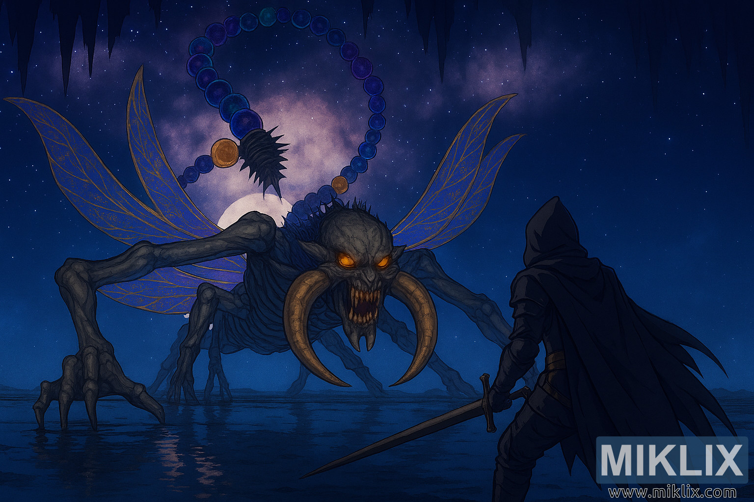 நட்சத்திரங்கள் நிறைந்த வானத்தின் கீழ் காட்சி விரிவடைகிறது, குகை கூரையில் தொங்கும் துண்டிக்கப்பட்ட ஸ்டாலாக்டைட்டுகளும், நீரில் மூழ்கிய நிலப்பரப்பில் ஊதா மற்றும் மெஜந்தா நிறங்களை வீசும் சுழலும் விண்மீன் நெபுலாவும் உள்ளன. ஆழமற்ற நிலத்தடி நதியின் பிரதிபலிப்பு மேற்பரப்பு வான பின்னணியையும் அதற்குள் உள்ள உருவங்களையும் பிரதிபலிக்கிறது, இது மாய சூழலை மேம்படுத்துகிறது.