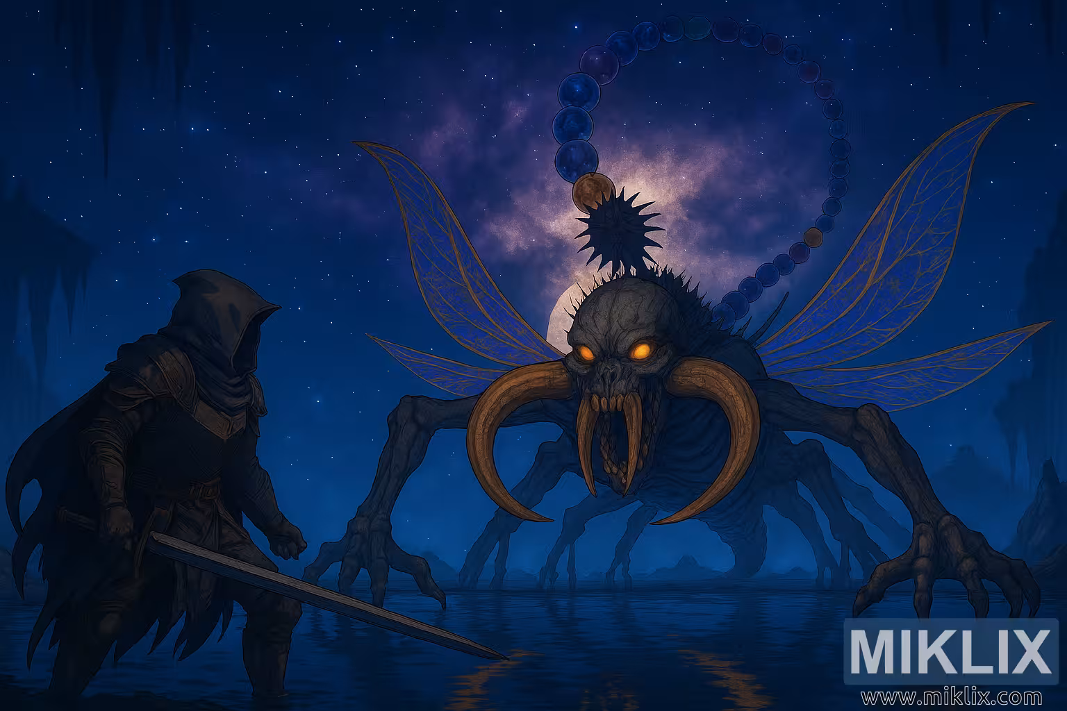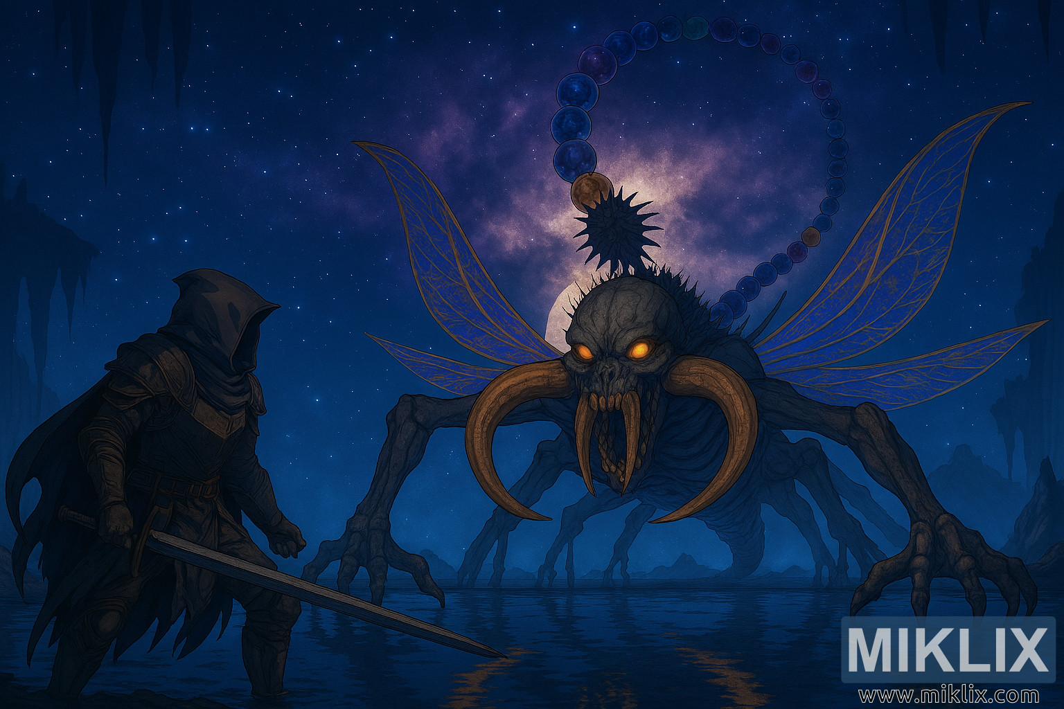 நட்சத்திரங்கள் நிறைந்த வானத்தின் கீழ் காட்சி விரிவடைகிறது, குகை கூரையில் தொங்கும் துண்டிக்கப்பட்ட ஸ்டாலாக்டைட்டுகளும், நீரில் மூழ்கிய நிலப்பரப்பில் ஊதா மற்றும் மெஜந்தா நிறங்களை வீசும் சுழலும் விண்மீன் நெபுலாவும் உள்ளன. ஆழமற்ற நிலத்தடி நதி வான பின்னணியையும் அதற்குள் உள்ள உருவங்களையும் பிரதிபலிக்கிறது, இது மாய சூழலை மேம்படுத்துகிறது.