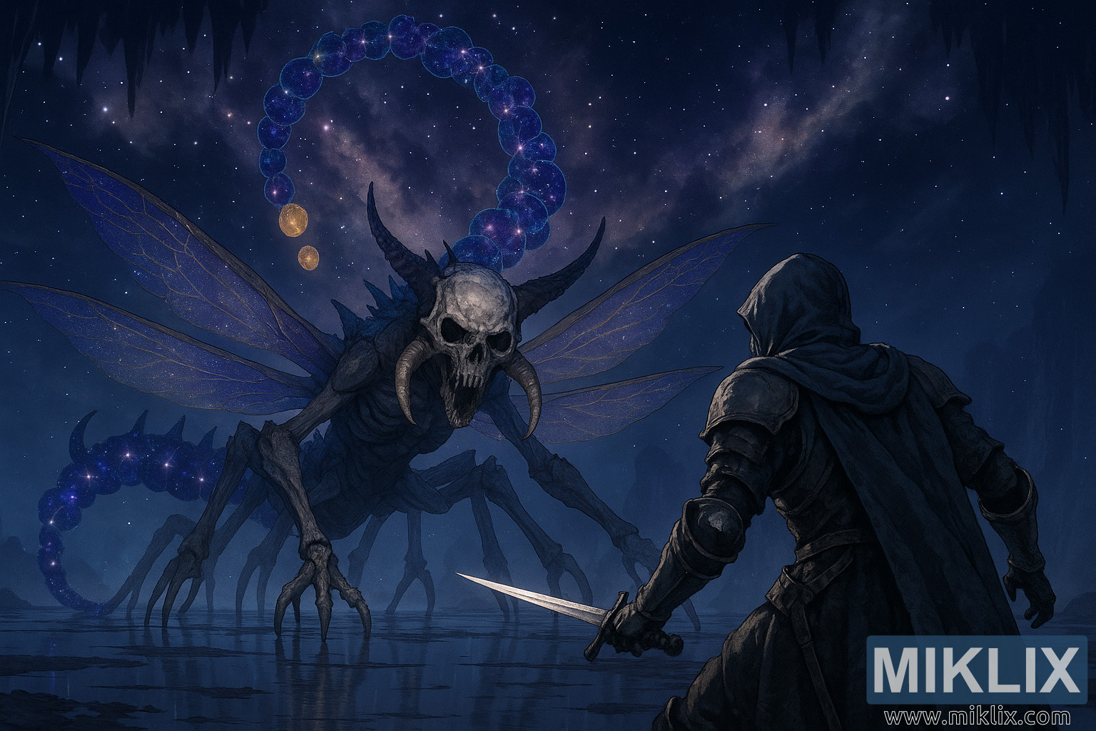 கிராண்ட் க்ளோஸ்டரில் மண்டை ஓடு தலை, பல கால்கள் மற்றும் ஒளிரும் விண்மீன் வால் கொண்ட ஒரு பரந்த வான பூச்சியாக சித்தரிக்கப்பட்டுள்ள, வெற்றிடத்தின் இயற்கையான பிறந்த ஆஸ்டலை எதிர்கொள்ளும் கறைபடிந்ததைக் காட்டும் காவிய அனிம் பாணி எல்டன் ரிங் ரசிகர் கலை.