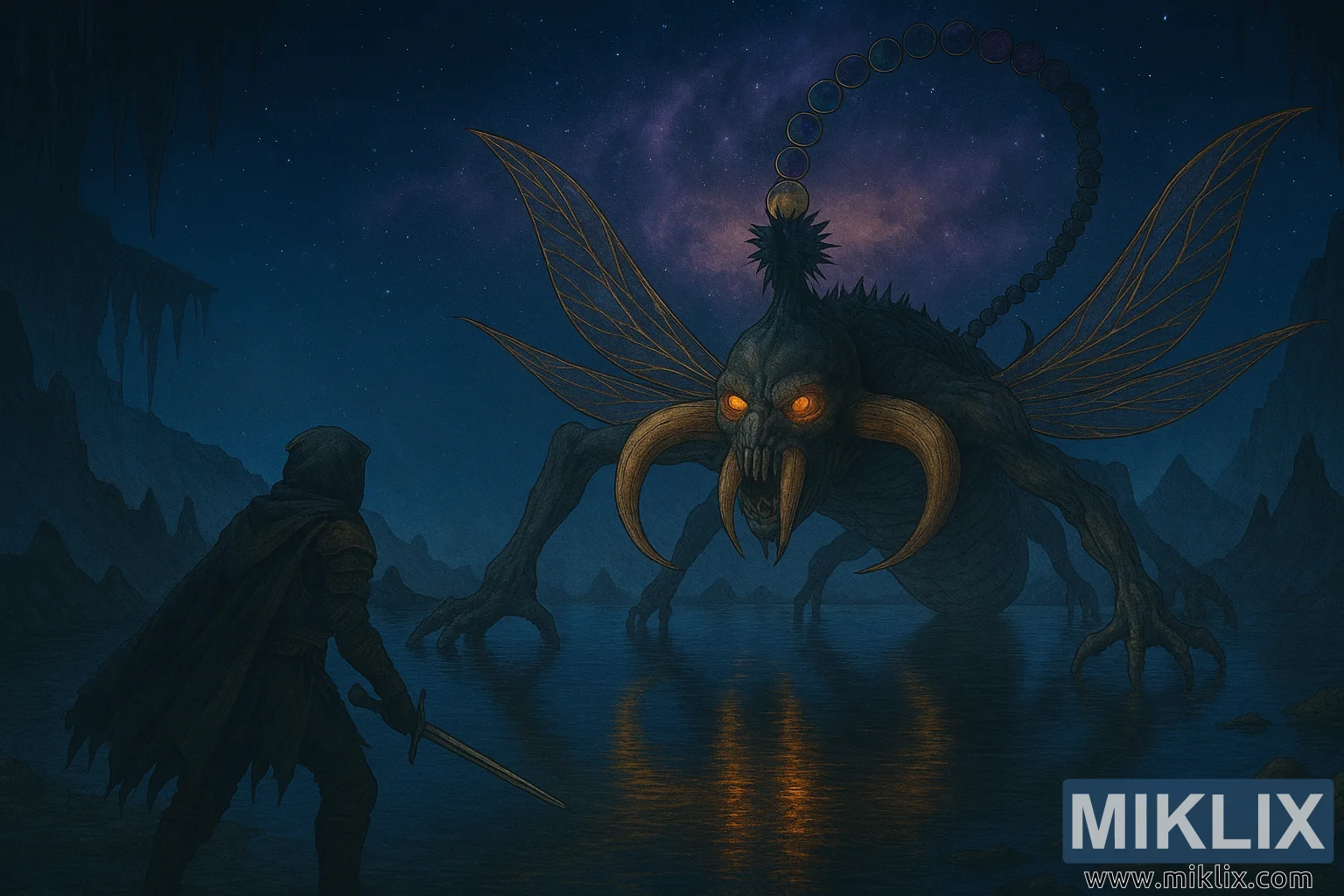 நட்சத்திரங்கள் நிறைந்த வானத்தின் கீழ் காட்சி விரிவடைகிறது, குகை கூரையில் தொங்கும் துண்டிக்கப்பட்ட ஸ்டாலாக்டைட்டுகளும், வெள்ளம் சூழ்ந்த நிலப்பரப்பில் ஊதா மற்றும் மெஜந்தா நிறங்களை வீசும் சுழலும் விண்மீன் நெபுலாவும் உள்ளன. ஆழமற்ற நிலத்தடி நதி வான பின்னணியையும் அதற்குள் உள்ள உருவங்களையும் பிரதிபலிக்கிறது, இது மாய சூழலை மேம்படுத்துகிறது.