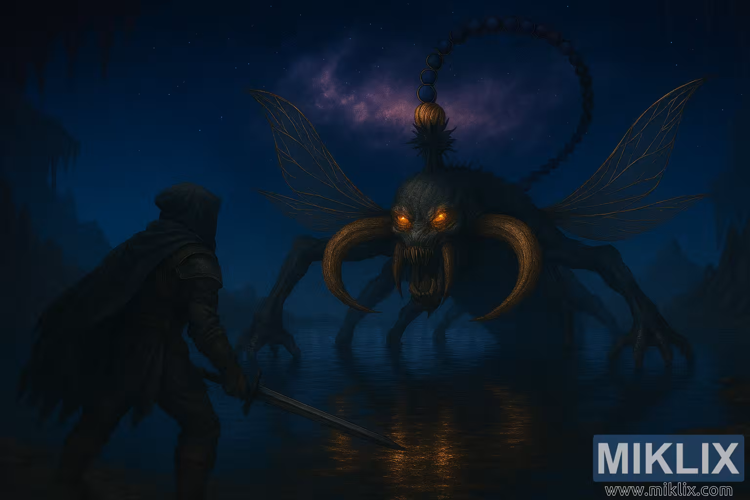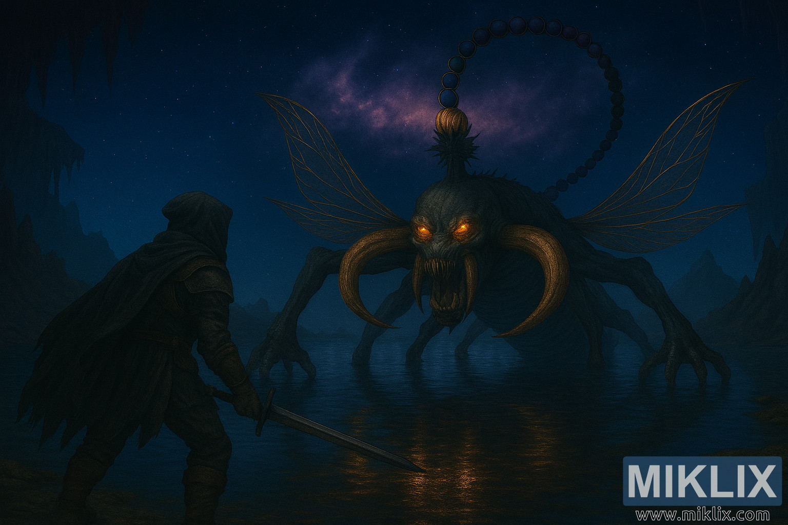நட்சத்திரங்கள் நிறைந்த வானத்தின் கீழ் காட்சி விரிவடைகிறது, குகை கூரையில் தொங்கும் துண்டிக்கப்பட்ட ஸ்டாலாக்டைட்டுகளும், வெள்ளம் சூழ்ந்த நிலப்பரப்பில் ஊதா மற்றும் மெஜந்தா நிறங்களை வீசும் சுழலும் விண்மீன் நெபுலாவும் உள்ளன. ஆழமற்ற நிலத்தடி நதி வான பின்னணியையும் அதற்குள் உள்ள உருவங்களையும் பிரதிபலிக்கிறது, இது மாய சூழலை மேம்படுத்துகிறது.