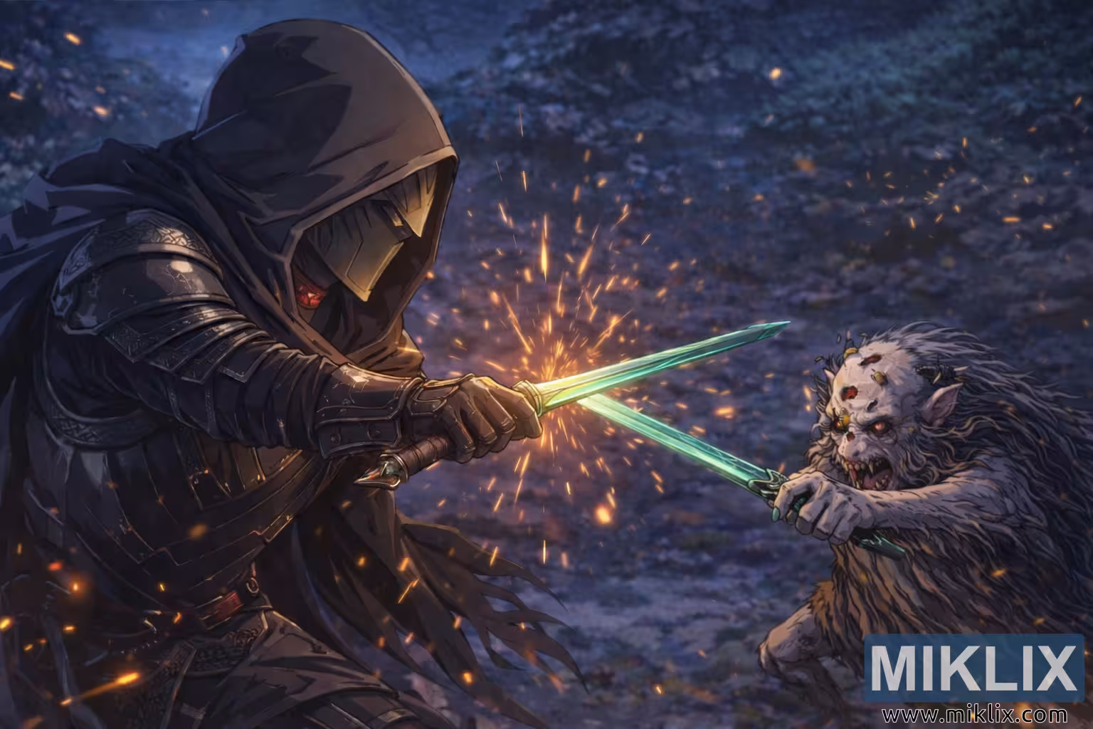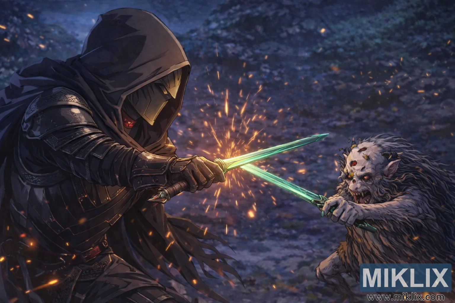 இந்தப் படம், எல்டன் ரிங்கின் இருண்ட கற்பனை உலகத்தால் தெளிவாக ஈர்க்கப்பட்டு, குளிர்ந்த, நிலவொளி பள்ளத்தாக்கில் அமைக்கப்பட்ட ஒரு கடுமையான சண்டையின் சினிமா, அனிம்-ஈர்க்கப்பட்ட சித்தரிப்பை வழங்குகிறது. அகலமான, நிலப்பரப்பு அமைப்பின் இடது பக்கத்தில், சின்னமான கருப்பு கத்தி கவசத்தை அணிந்த உயரமான, கம்பீரமான போர்வீரன் டார்னிஷ்டு நிற்கிறார். கவசம் நுணுக்கமான விவரங்களுடன் வரையப்பட்டுள்ளது: ஒன்றுடன் ஒன்று இருண்ட தகடுகள் நுட்பமான வெள்ளி வேலைப்பாடுகளால் பொறிக்கப்பட்டுள்ளன, அதே நேரத்தில் அடுக்கு தோல் பட்டைகள் மற்றும் துணி மடிப்புகள் பல வருட தேய்மானம் மற்றும் போரை பரிந்துரைக்கின்றன. ஒரு ஆழமான பேட்டை டார்னிஷ்டுகளின் பெரும்பாலான முகத்தை மறைக்கிறது, இது பார்வைக்குள் இருந்து ஒரு மங்கலான சிவப்பு ஒளியை மட்டுமே ஒரு கவனமான, உறுதியான பார்வையைக் குறிக்க அனுமதிக்கிறது. போர்வீரனின் தோரணை பதட்டமாகவும் முன்னோக்கி சாய்வாகவும் உள்ளது, இரண்டு கைகளும் ஒரு மூலைவிட்டத்தில் வைத்திருக்கும் ஒரு குறுகிய கத்தியைச் சுற்றி உறுதியாகப் பூட்டப்பட்டுள்ளன, அதன் உலோக மேற்பரப்பு தீப்பொறிகளின் சூடான சுடரைப் பிடிக்கிறது.