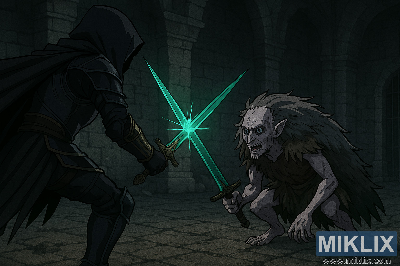பெலுராட் கோலுக்குள் டெமி-ஹ்யூமன் வாள்மாஸ்டர் ஓன்ஸேவுடன் போராடும் டார்னிஷ்டு இன் பிளாக் கத்தி கவசத்தின் உயர் தெளிவுத்திறன் கொண்ட அனிம் ரசிகர் கலை, வியத்தகு விளக்குகள் மற்றும் விரிவான நிலவறை சூழலைக் கொண்டுள்ளது.