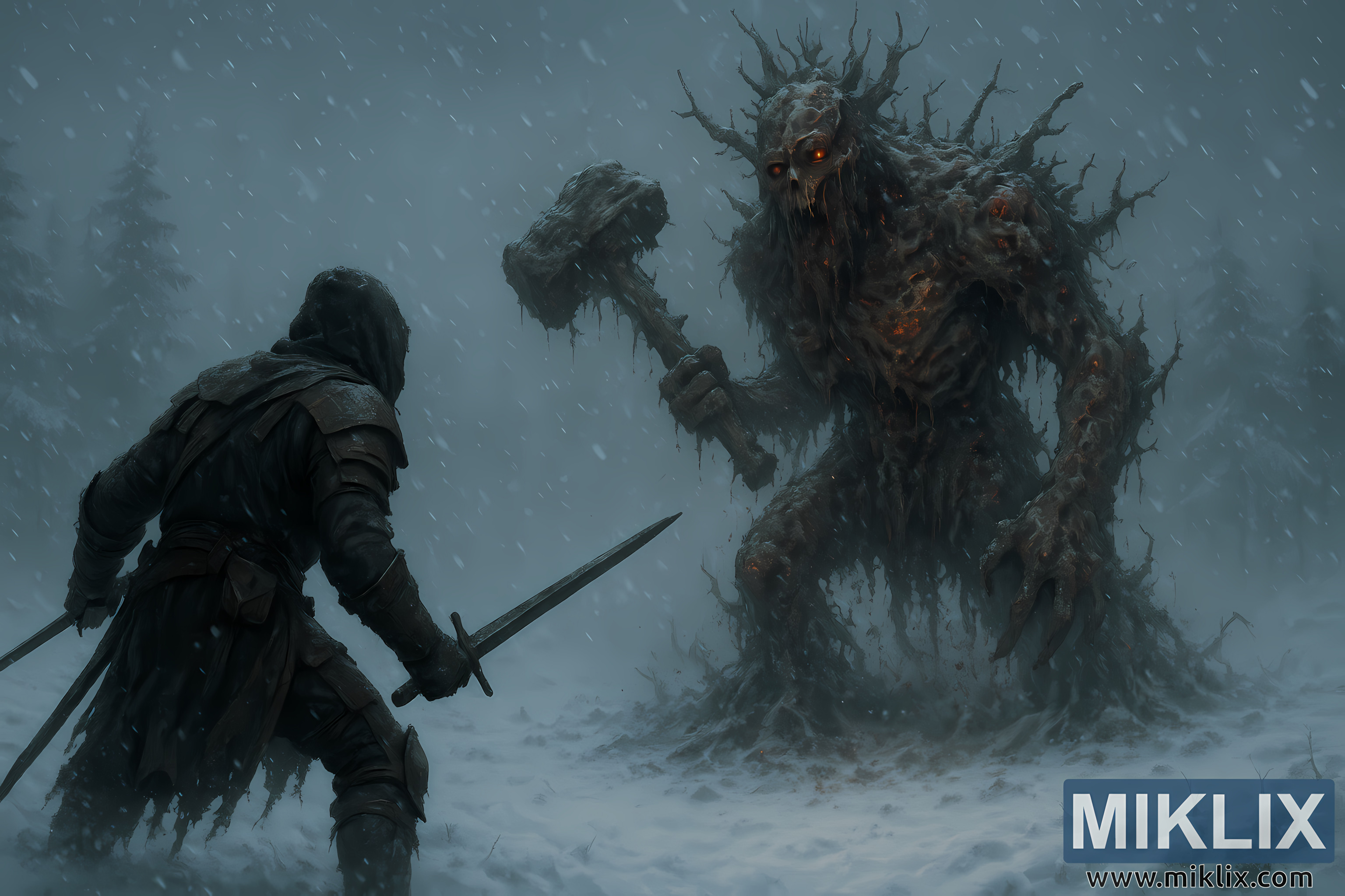இருண்ட கற்பனை நிலப்பரப்பில் ஒரு வன்முறையான பனிப்புயலுக்கு மத்தியில், இரட்டைத் திறன் கொண்ட ஒரு போர்வீரன், ஒரு பெரிய தடியுடன் ஒரு சிதைந்த, பிளேக் நோயால் பாதிக்கப்பட்ட மர அசுரனை எதிர்கொள்கிறான்.