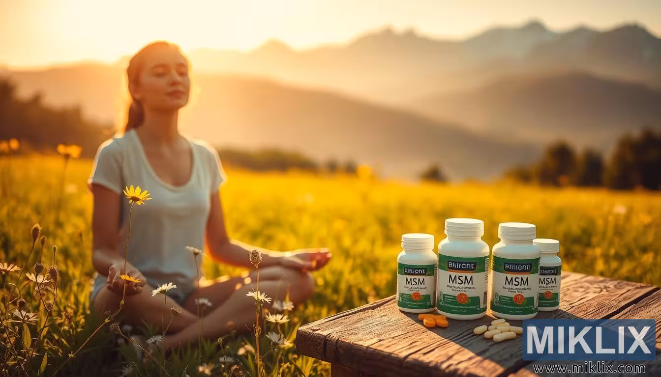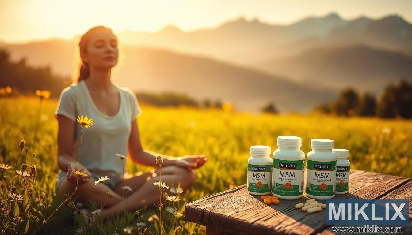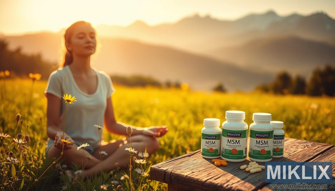 ధ్యానం చేస్తున్న వ్యక్తి మరియు MSM సప్లిమెంట్లతో కూడిన ప్రశాంతమైన గడ్డి మైదాన దృశ్యం, ఇది సహజ సామరస్యాన్ని మరియు అలెర్జీ ఉపశమనం మరియు ఆరోగ్యంలో MSM పాత్రను సూచిస్తుంది.
