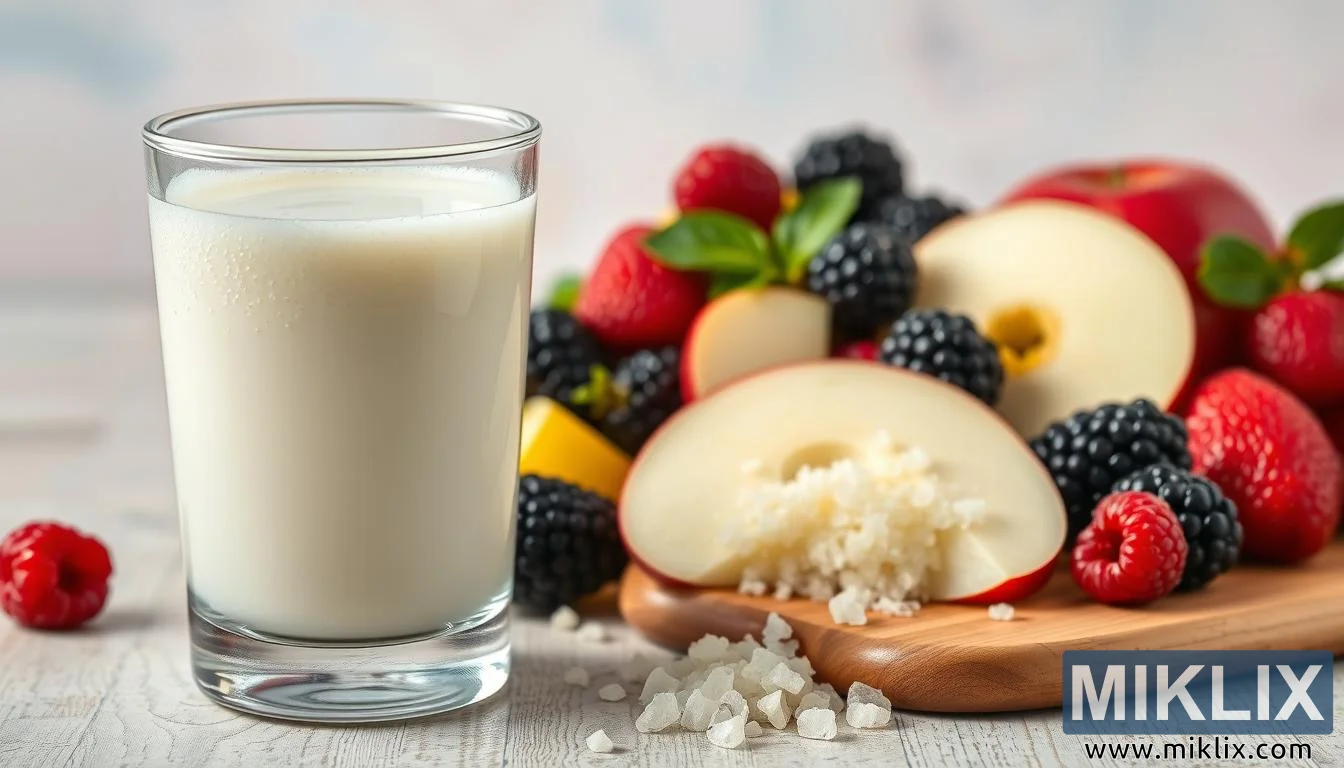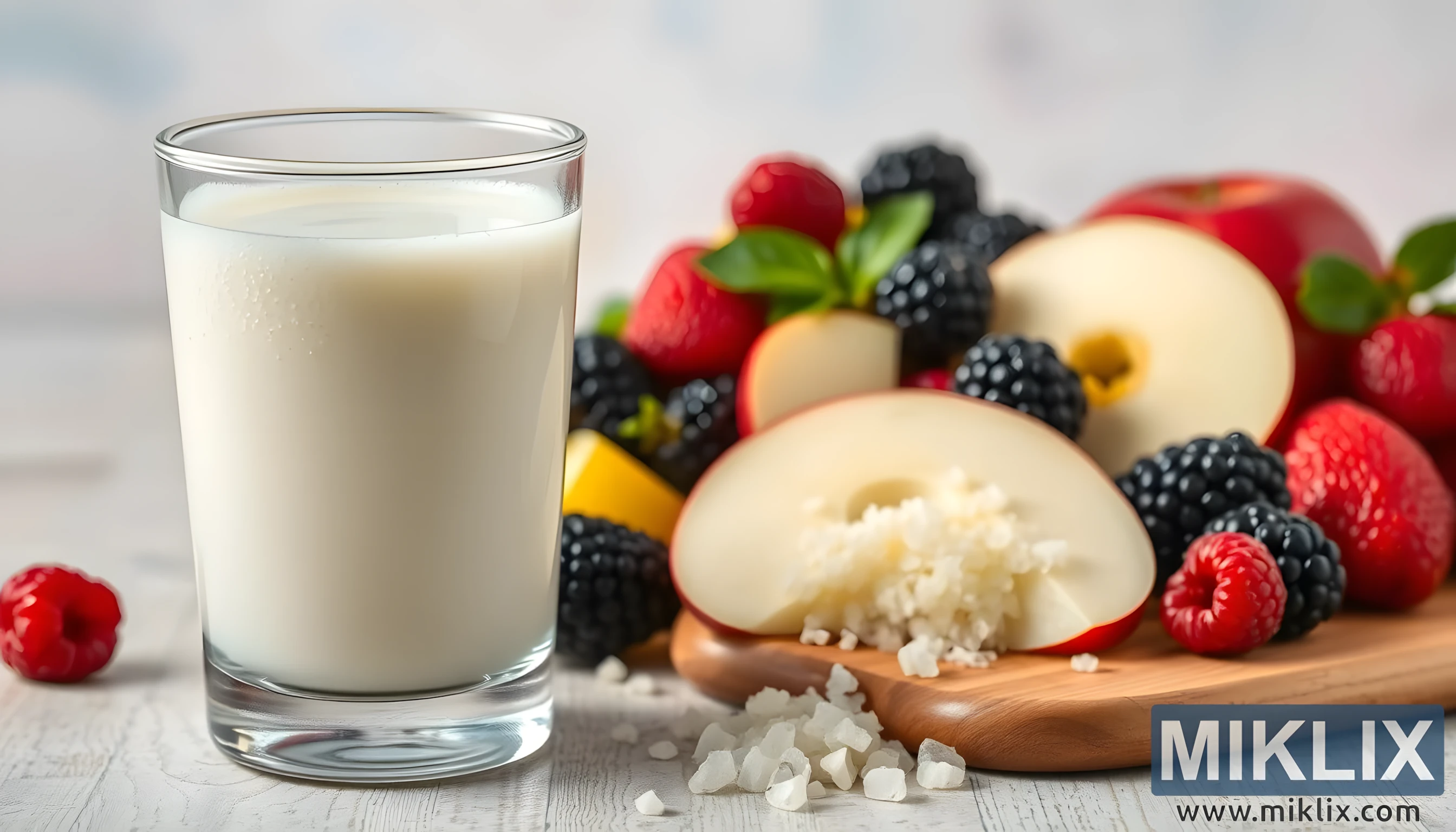గాజు పక్కనే, ఒక చెక్క కట్టింగ్ బోర్డు పండ్లు మరియు ప్రోబయోటిక్ కేఫీర్ గింజల యొక్క కళాత్మక అమరికకు కాన్వాస్గా మారుతుంది. సగం కోసిన ఆపిల్లు వాటి స్ఫుటమైన, మంచుతో కూడిన మాంసాన్ని వెల్లడిస్తాయి, వాటిలో ఒకటి మధ్యలో కేఫీర్ గింజల సమూహంతో నిండి ఉంటుంది, దృశ్యమానంగా పండ్లను పానీయంతో మరియు కేఫీర్కు దాని ప్రత్యేక లక్షణాన్ని ఇచ్చే సహజ కిణ్వ ప్రక్రియ ప్రక్రియతో కలుపుతుంది. ఆకృతి మరియు ఆకారంలో కొద్దిగా క్రమరహితంగా ఉండే గింజలు, చిన్న ముత్యాల సమూహాల వలె మెరుస్తాయి, సాధారణ పాలను ప్రోబయోటిక్స్ యొక్క శక్తి కేంద్రంగా మార్చే జీవన సంస్కృతిగా వారి పాత్రను సూచిస్తాయి. ఆపిల్ల చుట్టూ, బ్లాక్బెర్రీస్, రాస్ప్బెర్రీస్ మరియు స్ట్రాబెర్రీల సమృద్ధిగా చెల్లాచెదురుగా ఉండటం క్రీమీ కేఫీర్కు వ్యతిరేకంగా స్పష్టమైన వ్యత్యాసాన్ని సృష్టిస్తుంది, వాటి ముదురు ఊదా మరియు ప్రకాశవంతమైన ఎరుపు రంగులు సహజ ఉత్సాహంతో పగిలిపోతాయి. పండ్లు, వాటి జ్యుసి మెరుపు మరియు తాజాగా ఎంచుకున్న రూపంతో, రంగును జోడించడమే కాకుండా, కేఫీర్ మరియు ప్రకృతి ఉత్పత్తుల మధ్య ఆరోగ్యకరమైన సినర్జీని కూడా నొక్కి చెబుతాయి.