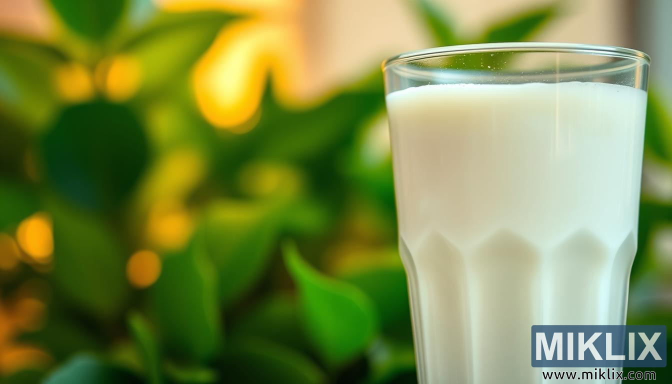 పచ్చని నేపథ్యంలో క్రీమీ కేఫీర్ గ్లాసు, జీర్ణ ఆరోగ్యం మరియు వెల్నెస్ కోసం దాని ప్రోబయోటిక్-రిచ్, పేగు-పోషక లక్షణాలను హైలైట్ చేస్తుంది.