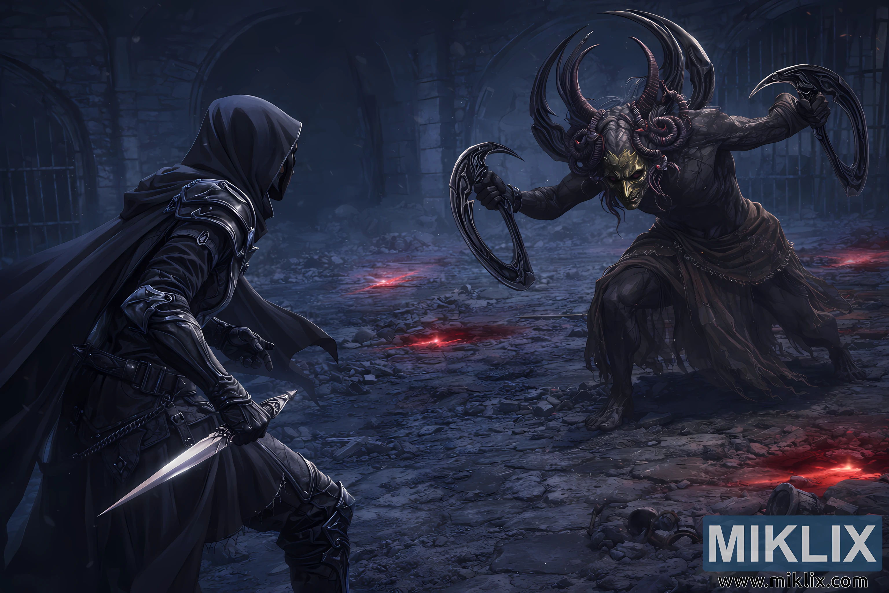 ఆ ఇద్దరు వ్యక్తులు కొన్ని మీటర్ల దూరం మాత్రమే శిథిలాలతో నిండిన నేలతో వేరు చేయబడ్డారు, వారి చూపులు లాక్ అయ్యాయి. ఇంకా ఎవరూ కొట్టలేదు, కానీ కూర్పు ఉద్రిక్తతతో మ్రోగుతుంది, ఊహించిన ఉక్కు గీత మరియు జీవి యొక్క కరకరలాడే శ్వాస ద్వారా మాత్రమే చెరసాల నిశ్శబ్దం విచ్ఛిన్నమవుతుంది. కెమెరా కోణం తక్కువగా మరియు సినిమాటిక్గా ఉంది, లాబిరిత్ యొక్క ముప్పును నొక్కి చెబుతూనే కళంకితుడిని వీరోచితంగా మరియు ధిక్కారంగా ఉంచుతుంది. మొత్తం మానసిక స్థితి సస్పెండ్ చేయబడిన హింసతో కూడుకున్నది: గందరగోళం చెలరేగడానికి ముందు ఘనీభవించిన హృదయ స్పందన, బోనీ గాల్ లోతుల్లో బ్లేడ్లు ఢీకొనే ముందు క్షణాన్ని అమరత్వం చేస్తుంది.