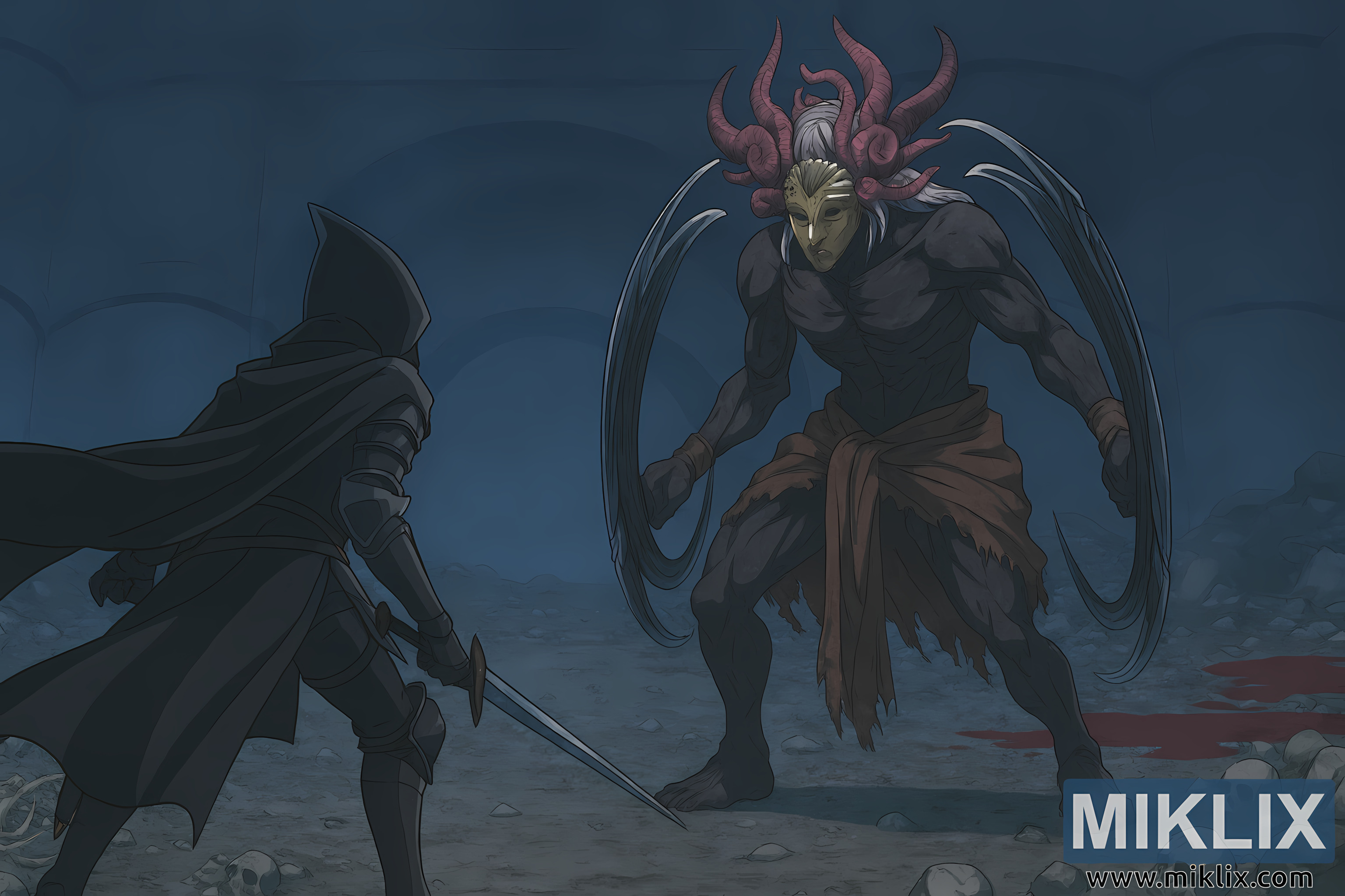 చిత్రం యొక్క కూర్పు సమతుల్యమైనది మరియు సినిమాటిక్ గా ఉంది, పాత్రల భంగిమలు మరియు ఆయుధాల ద్వారా సృష్టించబడిన వికర్ణ రేఖలు వీక్షకుడి దృష్టిని కేంద్రం వైపు ఆకర్షిస్తాయి. రంగుల పాలెట్ చల్లని నీలం మరియు బూడిద రంగులతో ఆధిపత్యం చెలాయిస్తుంది, లాబిరిత్ కొమ్ముల వెచ్చని ఎరుపు మరియు రక్తపు మరకలతో విరామ చిహ్నాలు ఉంటాయి. అనిమే-ప్రేరేపిత రెండరింగ్ శైలి బోల్డ్ అవుట్లైన్లు, డైనమిక్ షేడింగ్ మరియు చక్కటి వివరాలను మిళితం చేసి, నాటకీయ మరియు లీనమయ్యే దృశ్య కథనాన్ని అందిస్తుంది.