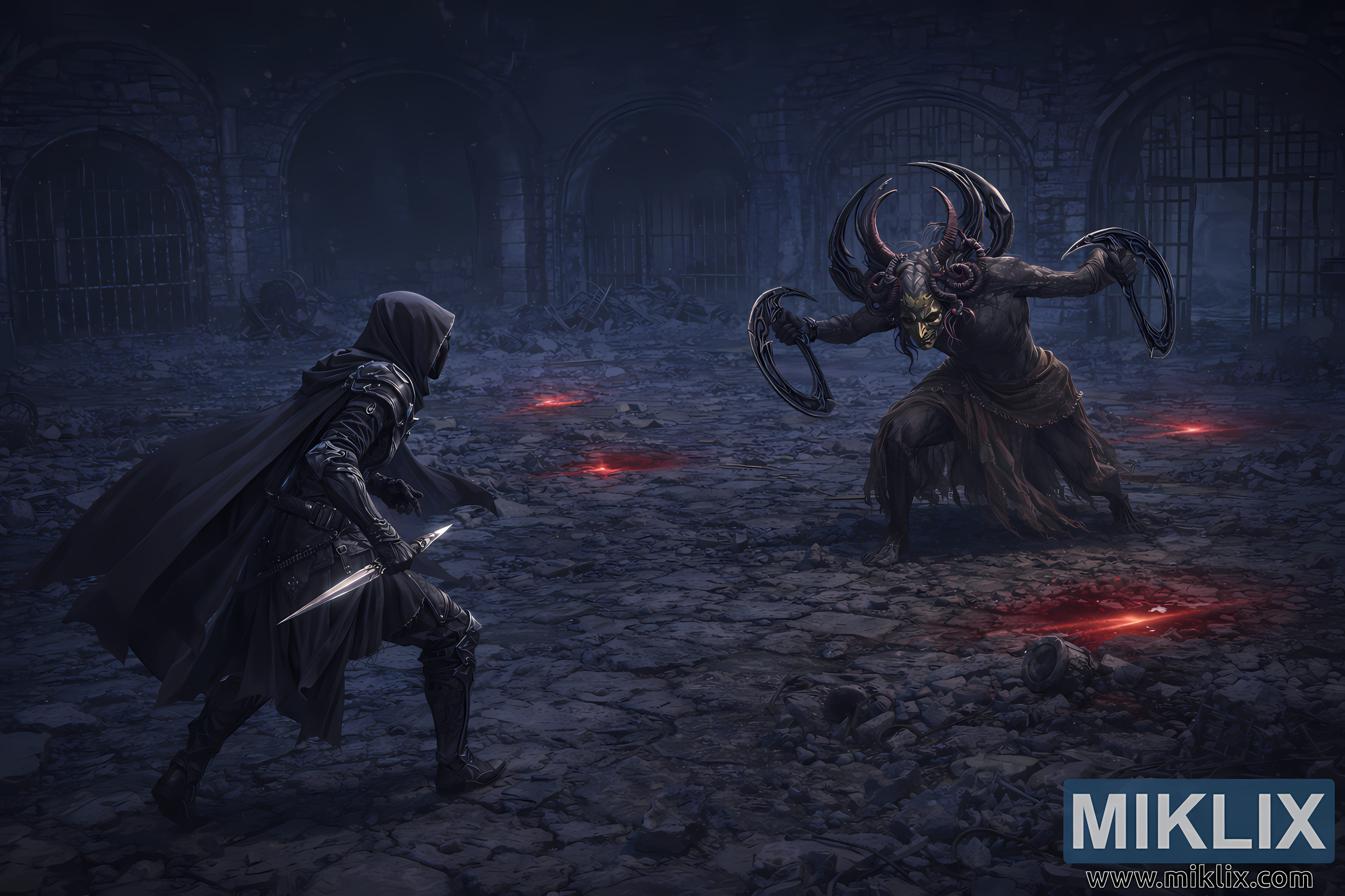 ఎదురుగా, కుడి వైపున, చెల్లాచెదురుగా ఉన్న శిథిలాల పైన దాని అమానుష రూపం పైకి లేచింది. దాని చర్మం అనారోగ్యకరమైన బొగ్గు రంగులో ఉంది, వైర్ కండరాల అంతటా గట్టిగా విస్తరించి ఉంది. దాని తల మొలక నుండి వక్రీకృత కొమ్ము లాంటి నిర్మాణాలు బ్లేడ్డ్ కొమ్ముల వలె బయటికి వంగి, దాని ముఖానికి అనుసంధానించబడిన వికారమైన బంగారు ముసుగును తయారు చేస్తాయి. దాని పుర్రె మరియు మెడ చుట్టూ ముదురు, కండగల టెండ్రిల్స్ చుట్టబడి, జీవి యొక్క పీడకల సిల్హౌట్కు జోడించబడతాయి. దాని ప్రతి చేతులు చంద్రవంక ఆకారపు రింగ్ బ్లేడ్ను పట్టుకుంటాయి, వాటి రంపపు అంచులు రాయిలో మెరుస్తున్న గుర్తుల నుండి రక్తం కారుతున్న మసక ఎరుపు మెరుపును పట్టుకుంటాయి.