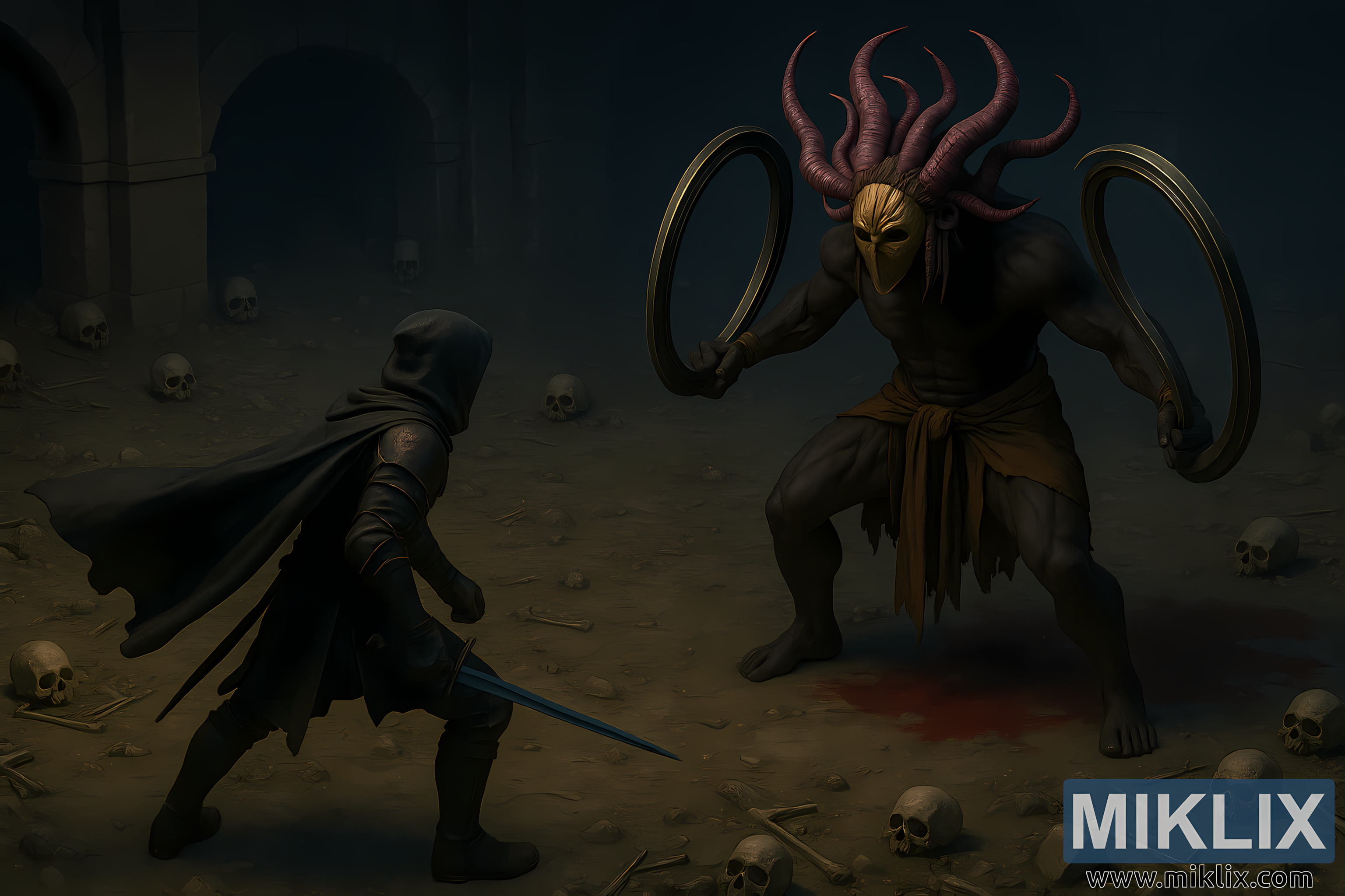 3D- రెండర్ చేయబడిన డిజిటల్ చిత్రం ఒక పురాతన, మసక వెలుతురు ఉన్న, భూగర్భ గదిలో ఇద్దరు వ్యక్తుల మధ్య ఉద్రిక్త ఘర్షణను సంగ్రహిస్తుంది. మానవ పుర్రెలు, ఎముకలు మరియు శిధిలాలతో నిండిన వాతావరణం మధ్య, టార్నిష్డ్ యోధుడు ఎడమ వైపున, కుడి వైపున కర్స్బ్లేడ్ లాబిరిత్ను ఎదుర్కొంటున్నాడు. గది నేల ధూళి మరియు చనిపోయినవారి చెల్లాచెదురుగా ఉన్న అవశేషాలతో కప్పబడి ఉంటుంది. నేపథ్యంలో, మందపాటి, వాతావరణ స్తంభాల మద్దతుతో చీకటిలోకి విస్తరించి ఉన్న భారీ రాతి తోరణాలు గది యొక్క విశాలతను మరియు పురాతన నిర్మాణాన్ని సూచిస్తాయి.